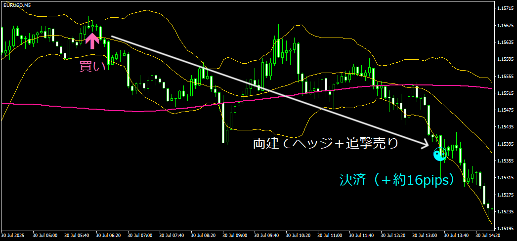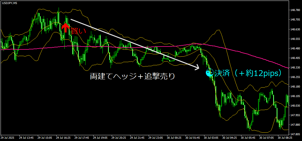 腕に自信がある方は相場の勢いに合わせて追加で追っかけエントリーやナンピンしても良いです。逆行しても両建てによるヘッジでリスクをコントロールしていきます。