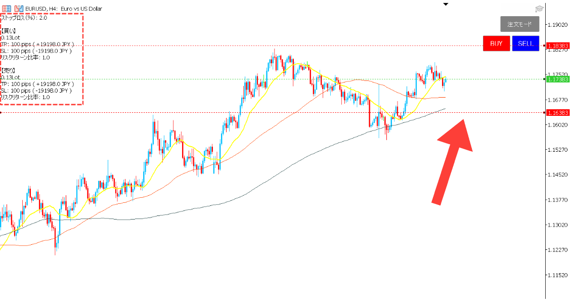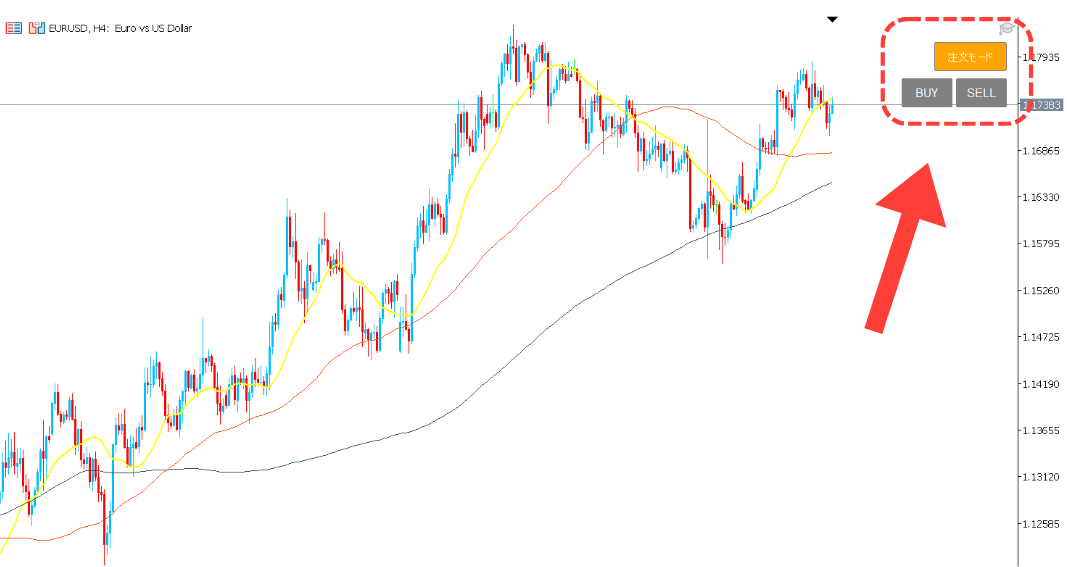 注文モードボタンを押し、ラインを以下のように設置、左の表示の【買い】の部分を確認します。↓