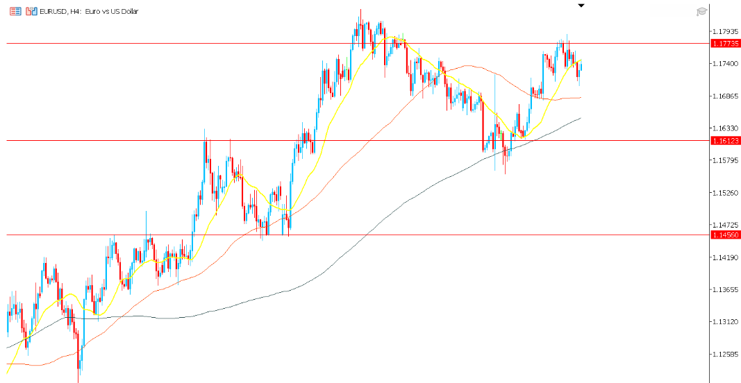 例えば、以下のユーロドルのチャートで、1.16123あたりまで下がったら買い注文を実行し、上の1.17735ラインで利確、損切は下のラインとの中間あたりに置きたい場合、(ラインは作成者の感覚で引いています)↓