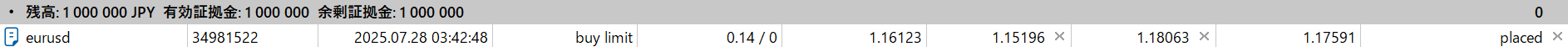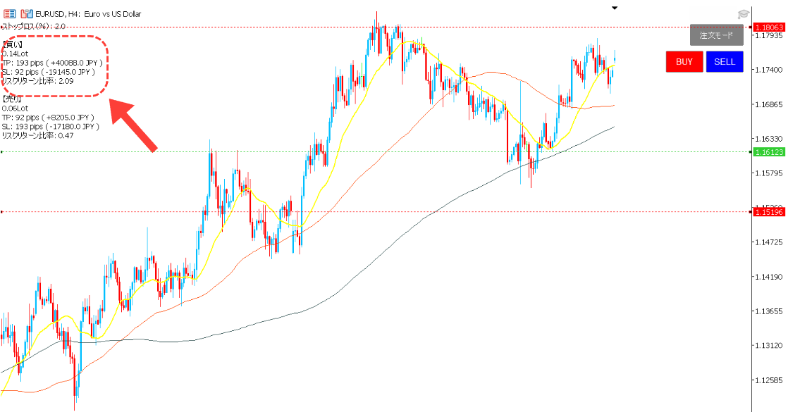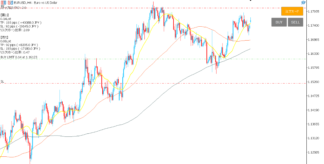 注文ライン、損切ライン、利確ラインを決めて注文ボタンを押すとパラメータに設定した損失率になるように自動でロットを調整して指値の待機注文を実行するものです。