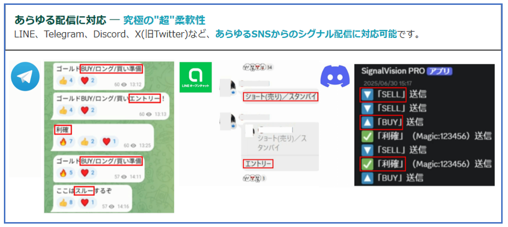 LINE、Telegram、Discord、X(旧Twitter)など、あらゆるSNSからのシグナル配信に対応可能。