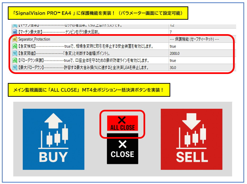 設定した許容損失に達した場合、取引を完全停止し全決済。感情を排した絶対的な損切り、まさに「最後の砦」です。 - 🛡️ ALL CLOSE 緊急決済ボタン: