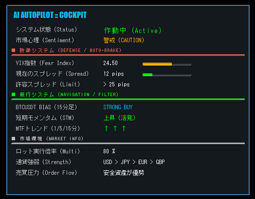 ① 守りの制御: VIX指数(恐怖指数)やスプレッドを監視し、危険な相場では「ロットの減速」や「緊急停止」を行います。