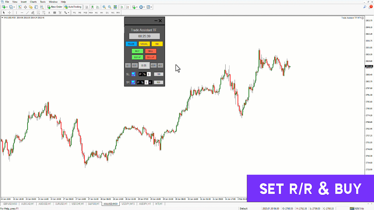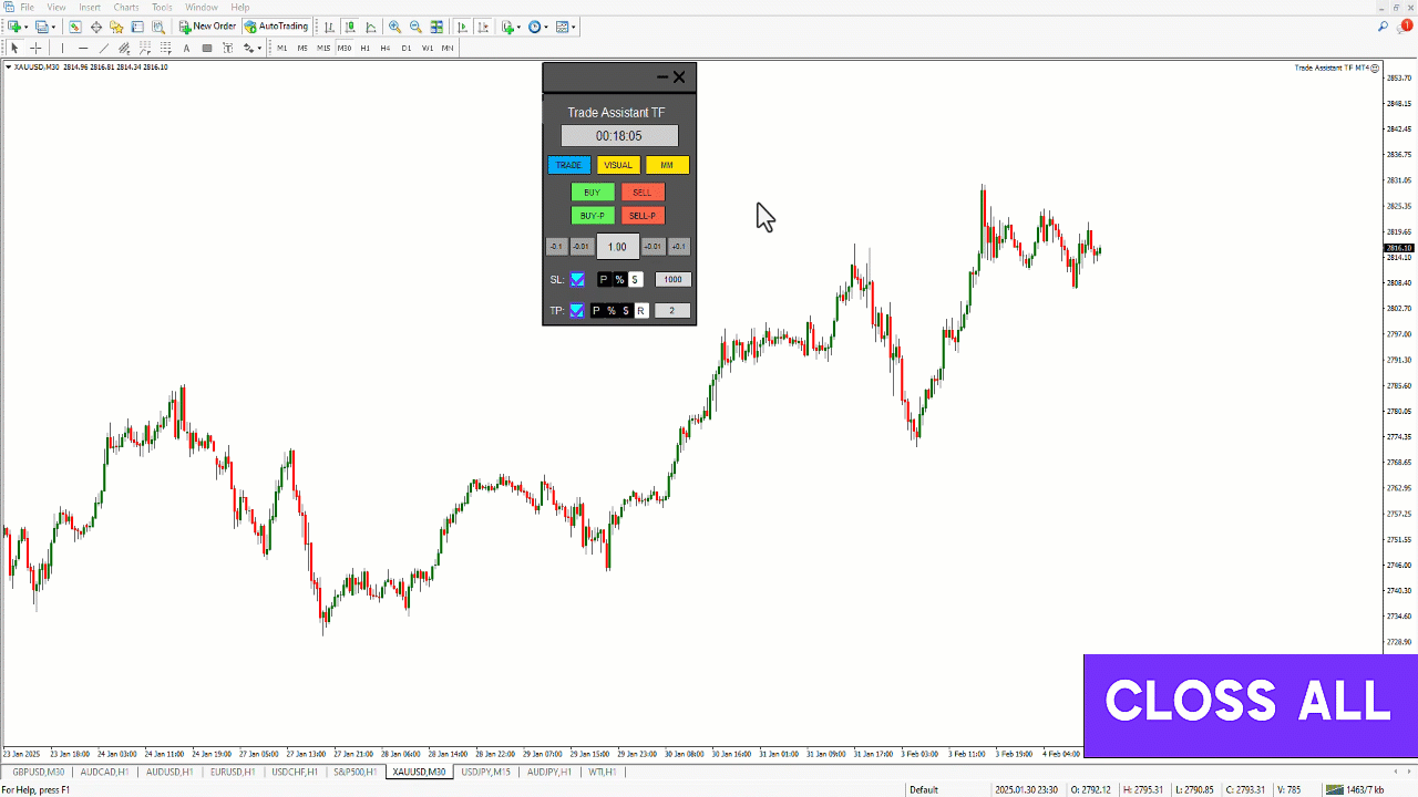 このトレードアシスタントエキスパートTFは、ポジション管理を効率化し、資本効率を向上させ、MetaTrader 4プラットフォーム内でのリスク管理を強化するために設計された強力なトレーディングツールです。初心者から経験豊富なトレーダーまで、このエキスパートアドバイザーは、トレードをより自信を持って、正確に管理するための直感的で機能豊富なインターフェースを提供します。