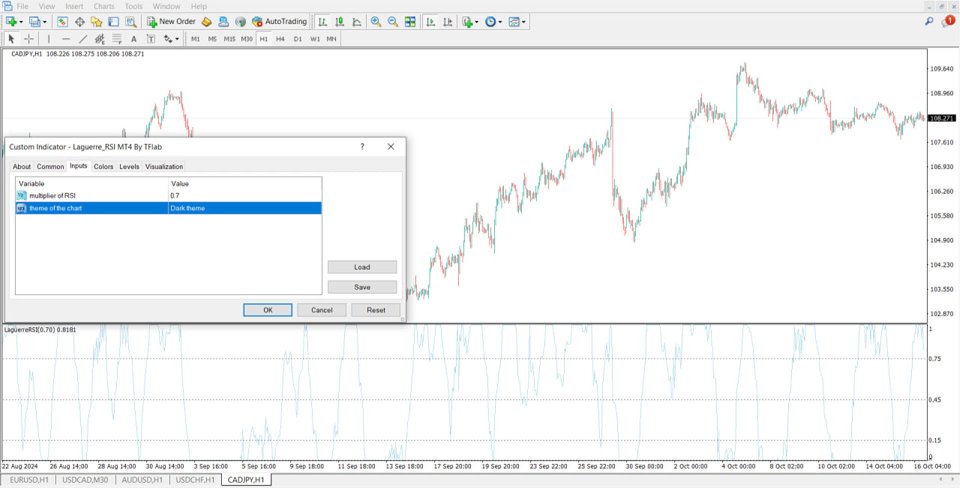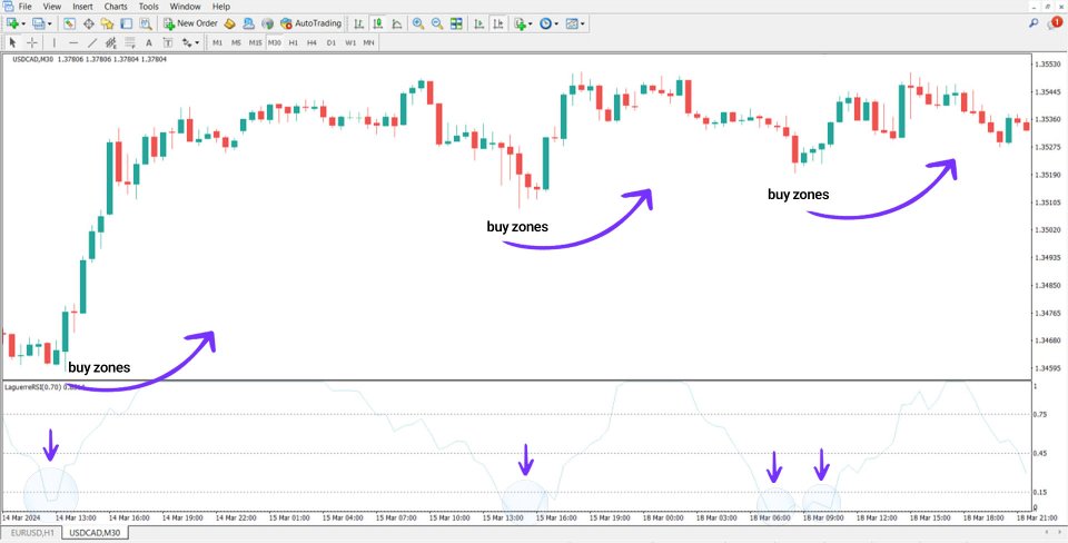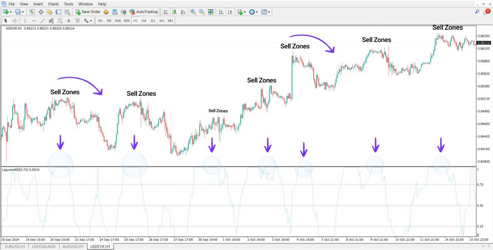 ラギエールRSIは、0〜1の範囲で値をプロットし、別ウィンドウに表示されます。主要なシグナルゾーンは以下の通りです: