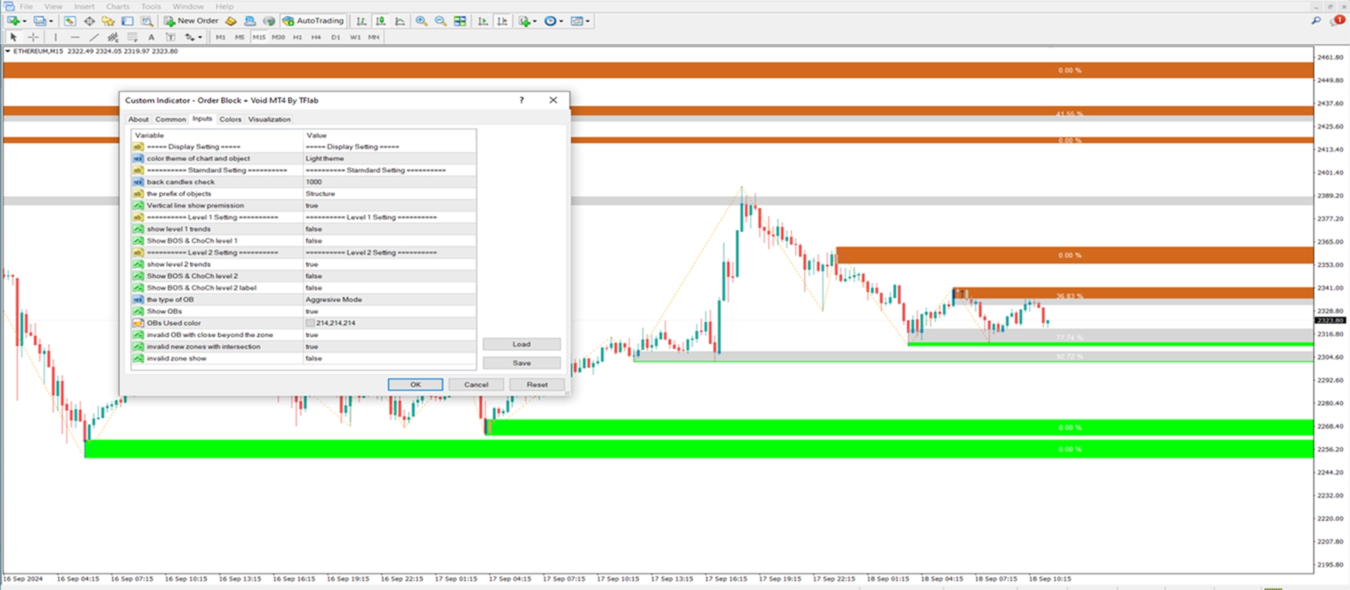 30分のETH/USDチャートでは、インジケーターが赤色のオーダーブロックを描画し、機関投資家の売りが行われたエリアを特定します。