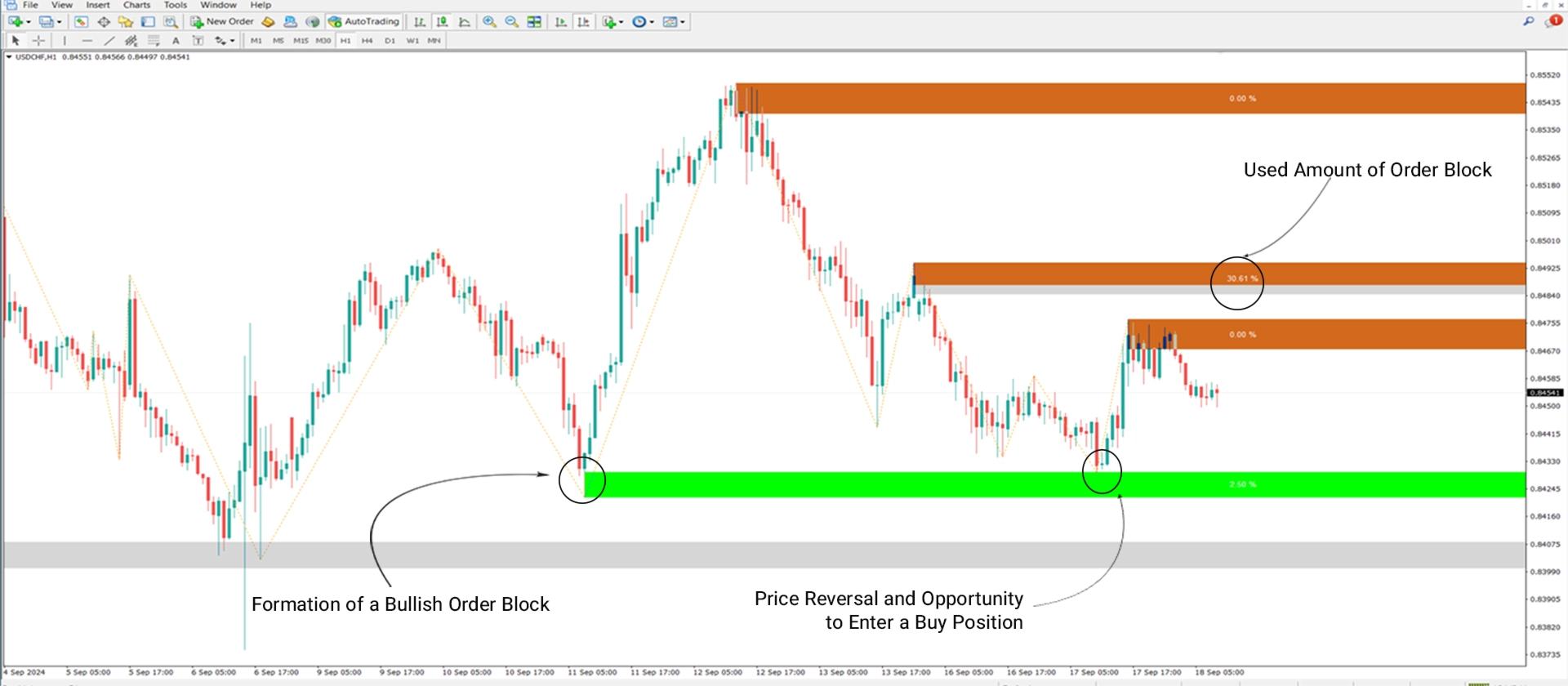 強気のオーダーブロック ℳ USD/CHF(H1)の例