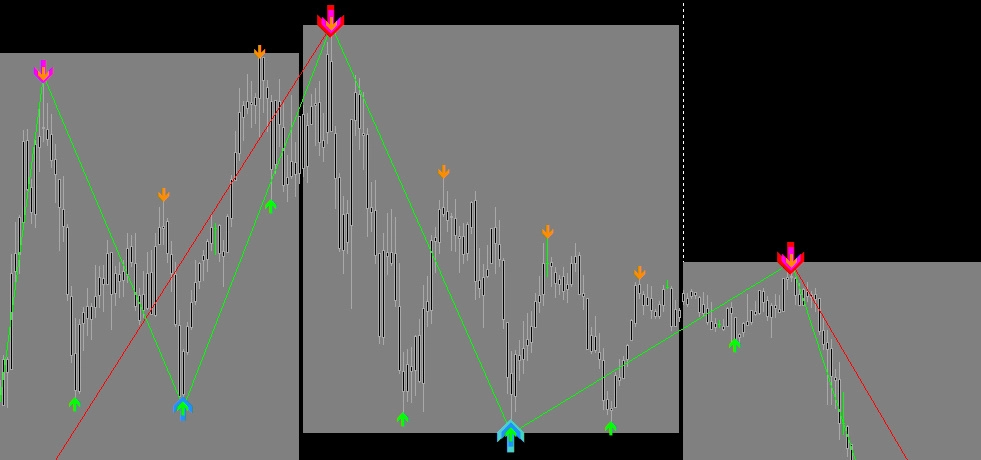 ・すべての時間足に対応 ・MT4チャートに表示対応(JPY/USD/ビットコイン・日経etc・・・) 【小】インジケーター(緑・オレンジ) 【中】インジケーター(青/緑・オレンジ/ピンク) 【大】インジケーター(水色/青/緑・オレンジ/ピンク/赤) 【ボックス】インジケーター(灰色) (説明)