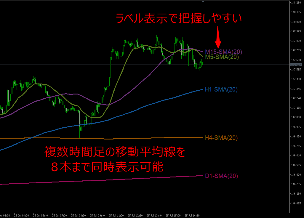 複数時間足の移動平均線をマルチタイム表示するインジケータ 上位足の移動平均線を、今のチャートに自動表示!