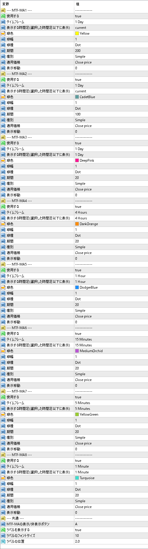 ●複数時間足の移動平均線を8本まで同時表示可能です。 ●各移動平均線のタイムフレームはカレント、M1、M5、M15、M30、H1、H4、D1、W1、MN1を指定できます。またMT4標準の移動平均線と同様に期間、種別、適応価格、シフトも指定可能です。 ●各移動平均線の表示/非表示ボタンを搭載しました。全ての移動平均線を同時に表示/非表示できます。(個別の移動平均線をそれぞれ表示/非表示できません) ●「各移動平均線をどの時間足チャート以下に表示するか」を設定できます。たとえば「1時間足以下に表示」と指定すると、日足や週足ではその移動平均線は自動的に非表示になります。これにより、大きい時間足に切り替えたときに、細かい移動平均線が邪魔にならず、チャートの視認性が大幅にアップします。 ●ラベル表示機能で各移動平均線の意味を瞬時に理解できます。各移動平均線にはラベルを表示でき、そこには「上位足のタイムフレーム」と「期間」が記載されます。これにより、今表示されている移動平均線が、どの時間足の何期間分なのかを、ひと目で把握できます。複数の移動平均線を同時に表示しても、視認性は抜群で分析精度の向上に役立ちます。インプットプロパティの設定項目