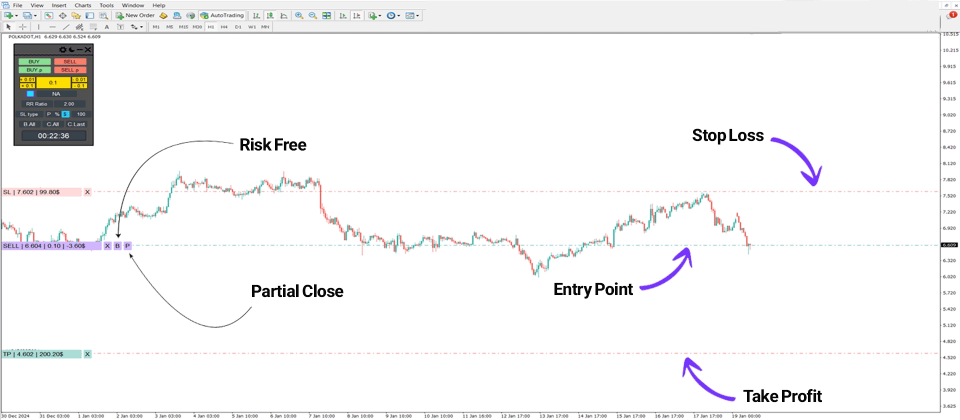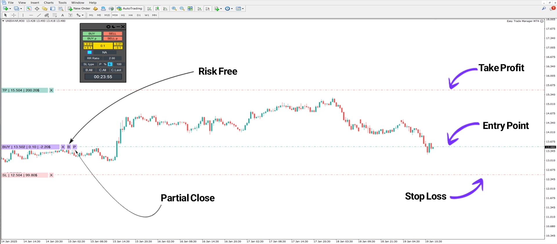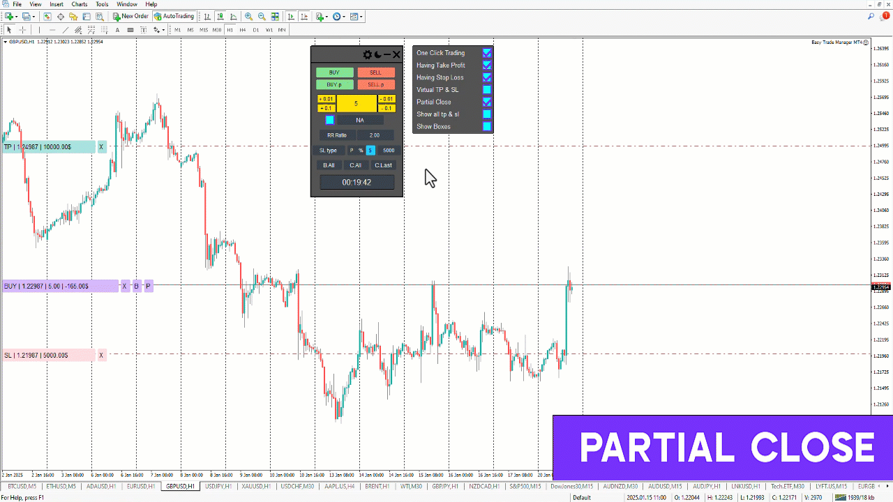 「B」ボタンを一度クリックすることで、取引はリスクフリーとしてマークされ、「P」ボタンを使用すると、戦略に基づいてポジションの50%を決済して利益を確保できます。