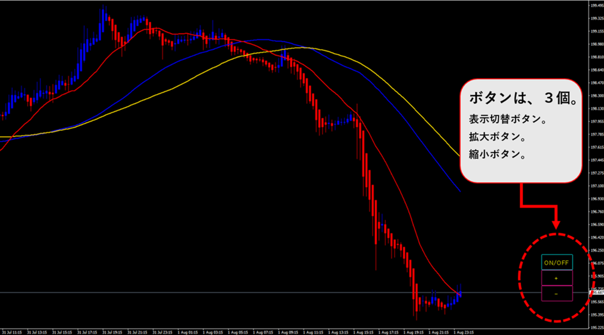 インジケータを消さずにボタン操作で簡単にロウソクを確認したくて作成しました。 ちょっと便利なロウソク表示切替えボタン。クリック毎に、(非表示、背面、前面)表示切替を行います。