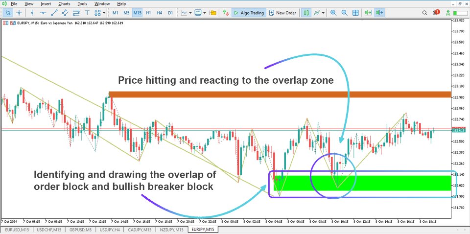 15分足のEUR/JPYチャートでは、ブレーカーブロックオーダーブロックの重なり部分が緑色で表示されます。