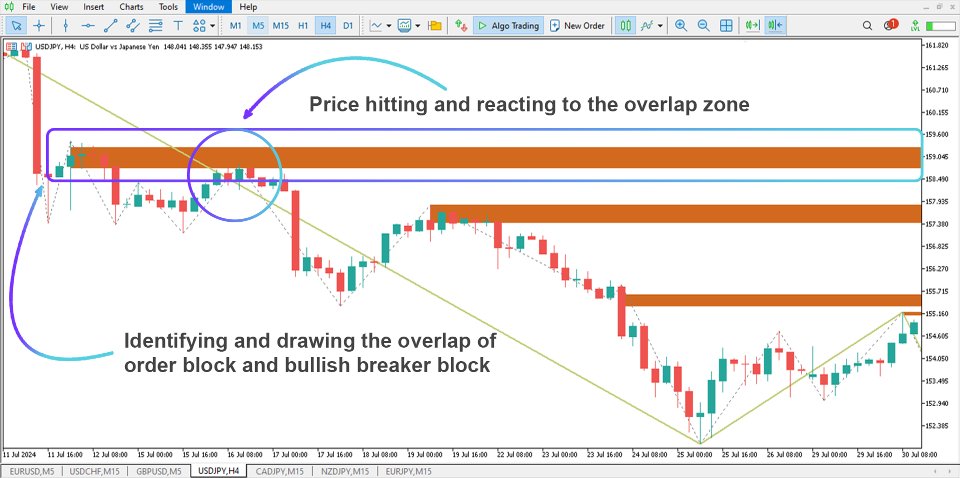 4時間足のUSD/JPYチャートでは、下降トレンド中に形成されたブレーカーブロックオーダーブロック茶色で重ねて表示されます。