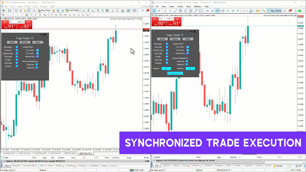わずかな操作で、新規注文のエントリー、ストップロス(SL)、テイクプロフィット(TP)、および利益確定レベルを、マスター口座からスレーブ口座へ即座に複製。遅延を排し、一貫性のあるトレード管理を可能にします。