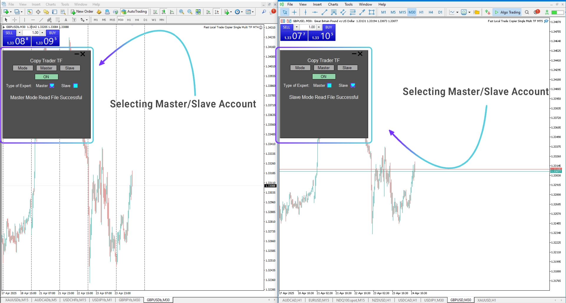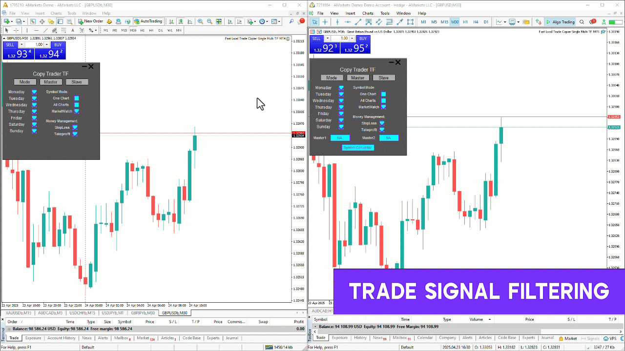 一度リンクされると、マスター口座で行われたすべての動作、新規ポジションのエントリー、SL/TPの調整、注文の決済を含め、即時にスレーブ口座へ反映されます。トレード複製の例買い注文の例1時間足のGBP/USDチャートで、マスター口座にて買いポジションを発注し、SLとTPを設定します。これらのパラメータは瞬時にスレーブ口座へコピーされ、両口座の取引内容が完全に一致します。売り注文の例30分足のBTCチャートで、マスター口座から発注された売りポジションが、SL/TPを含めてスレーブ口座に同時複製され、戦略の整合性が保たれます。コントロールパネル ℳ 主な設定項目モード選択·マスターℳ 取引信号の発信元·スレーブℳ コピー取引の受信先マスター設定·取引日指定ℳ 稼働させる曜日を選択·ワンチャートモードℳ 単一チャートのみコピー·オールチャートモードℳ すべてのチャートからコピー·マーケットウォッチ同期ℳ 銘柄をマーケットウォッチと一致させる·SL/TP管理ℳ SLとTPの転送と適用スレーブ設定·マスター1 IDℳ メインのマスター口座IDを指定·マスター2 IDℳ 任意のセカンダリーマスター口座IDを指定·シンボルマッピングツールℳ プラットフォーム間で銘柄名が異なる場合に調整選ばれる理由ファストローカルトレードコピーシングルマルチTFエキスパートMT4は、複数口座を効率的に管理するための必須ソリューションです。それは、人的ミスを削減し、MT4とMT5間のクロスプラットフォーム取引コピーをサポートし、あらゆる取引スタイルに合わせたカスタマイズ可能な設定オプションを提供します。プロプライエタリトレーディングファーム、口座管理者、およびミラートレーディング戦略を実行するすべての人に最適です。このツールは、あなたの取引活動が一貫性、精度、完全な同期性を確保できることを保証します。ファストローカルトレードコピー ℳシングル&マルチタイムフレームエキスパート(MT4)ファストローカルトレードコピーエキスパートは、複数のMetaTrader 4アカウント間でトレードを即時にミラーリングするための高性能ツールです。多機能なフローティングコントロールパネルを搭載し、アカウント間の同期やリアルタイムでの取引実行を、正確かつスムーズに行うことができます。わずかな操作で、新規注文のエントリー、ストップロス(SL)、テイクプロフィット(TP)、および利益確定レベルを、マスター口座からスレーブ口座へ即座に複製。遅延を排し、一貫性のあるトレード管理を可能にします。仕様ℳ ファストローカルトレードコピーエキスパートカテゴリートレードユーティリティプラットフォームMetaTrader 4推奨スキルレベル中・上級者エキスパートタイプ取引実行ℳ決済管理対応時間足マルチタイムフレーム対応取引スタイル高頻度取引ℳスキャルピングℳデイトレードℳスイング戦略対応市場全ての金融商品対応動作概要2つのアカウント間でトレードを同期させる手順は以下の通りです。1.マスター口座の設定ℳ すべての取引が発信される口座を指定2.スレーブ口座の設定ℳ マスターからの取引を受信する口座を指定3.アカウントのリンクℳ スレーブ側で、マスターの端末アドレスを入力し、安全な接続を確立一度リンクされると、マスター口座で行われたポジションの新規エントリー、SL/TPの変更、注文の決済まで、すべての動作が即時にスレーブ口座へ反映されます。トレード複製の例買い注文の例1時間足のGBP/USDチャートで、マスター口座にて買いポジションを発注し、SLとTPを設定。これらのパラメータは瞬時にスレーブ口座へコピーされ、両口座の取引内容が完全に一致します。売り注文の例30分足のBTCチャートで、マスター口座から発注された売りポジションが、SL/TPを含めてスレーブ口座に同時複製され、戦略の整合性が保たれます。コントロールパネルℳ主な設定項目モード選択·マスターℳ 取引信号の発信元·スレーブℳ コピー取引の受信先マスター設定·取引日指定ℳ 稼働させる曜日を選択·ワンチャートモードℳ 単一チャートのみコピー·オールチャートモードℳ すべてのチャートからコピー·マーケットウォッチ同期ℳ 銘柄をマーケットウォッチと一致させる·SL/TP管理ℳ SLとTPの転送と適用スレーブ設定·マスター1 IDℳ メインのマスター口座IDを指定を指定します。·マスター2 IDℳ 任意のセカンダリーマスター口座IDを指定します。·シンボルマッピングツールℳ プラットフォーム間で銘柄名が異なる場合に調整選ばれる理由ファストローカルトレードコピーシングルマルチTFエキスパートMT4は、複数口座を効率的に管理するための必須ソリューションです。人的ミスを削減し、MT4とMT5間のクロスプラットフォーム取引コピーにも対応。多様な設定オプションで、あらゆる取引スタイルに柔軟対応します。プロップファーム、口座管理者、ミラートレードを行うすべてのトレーダーにとって、取引の一貫性・精度・同期性を確保できる強力なツールです。