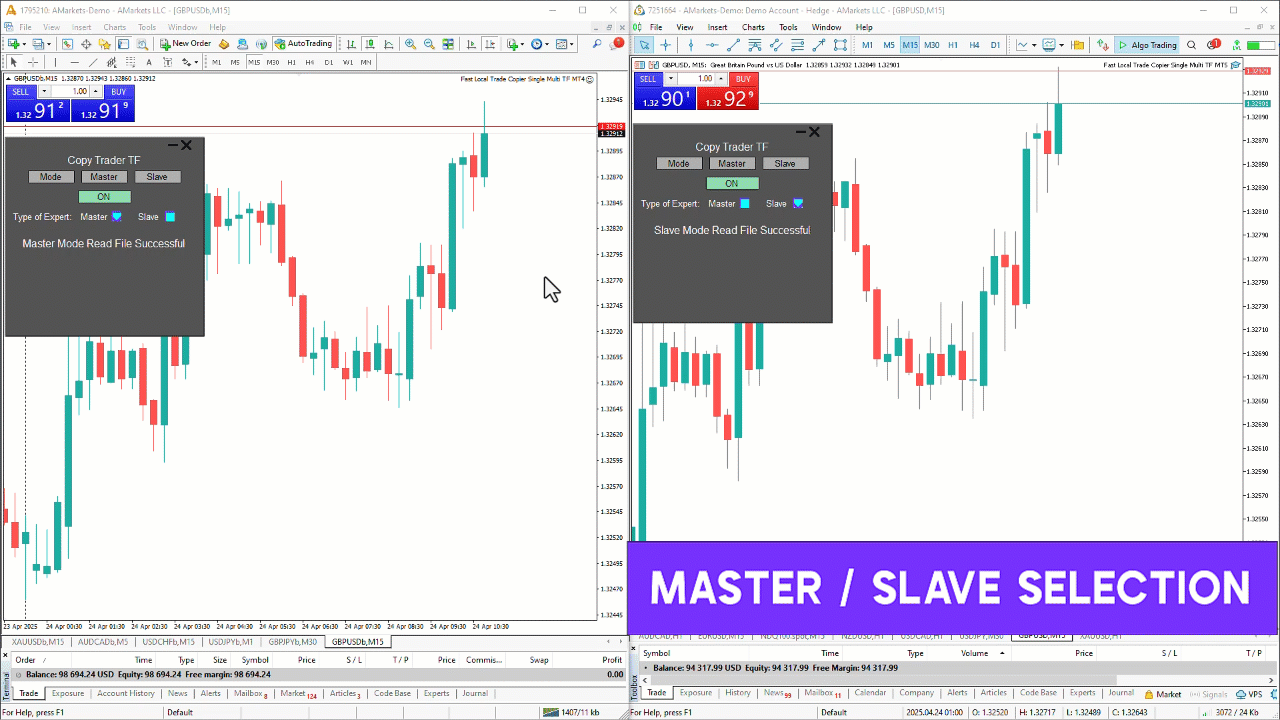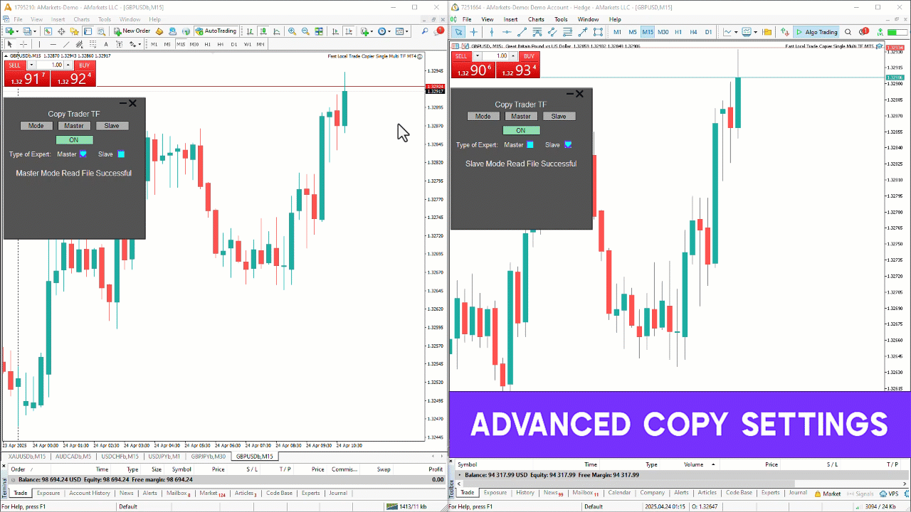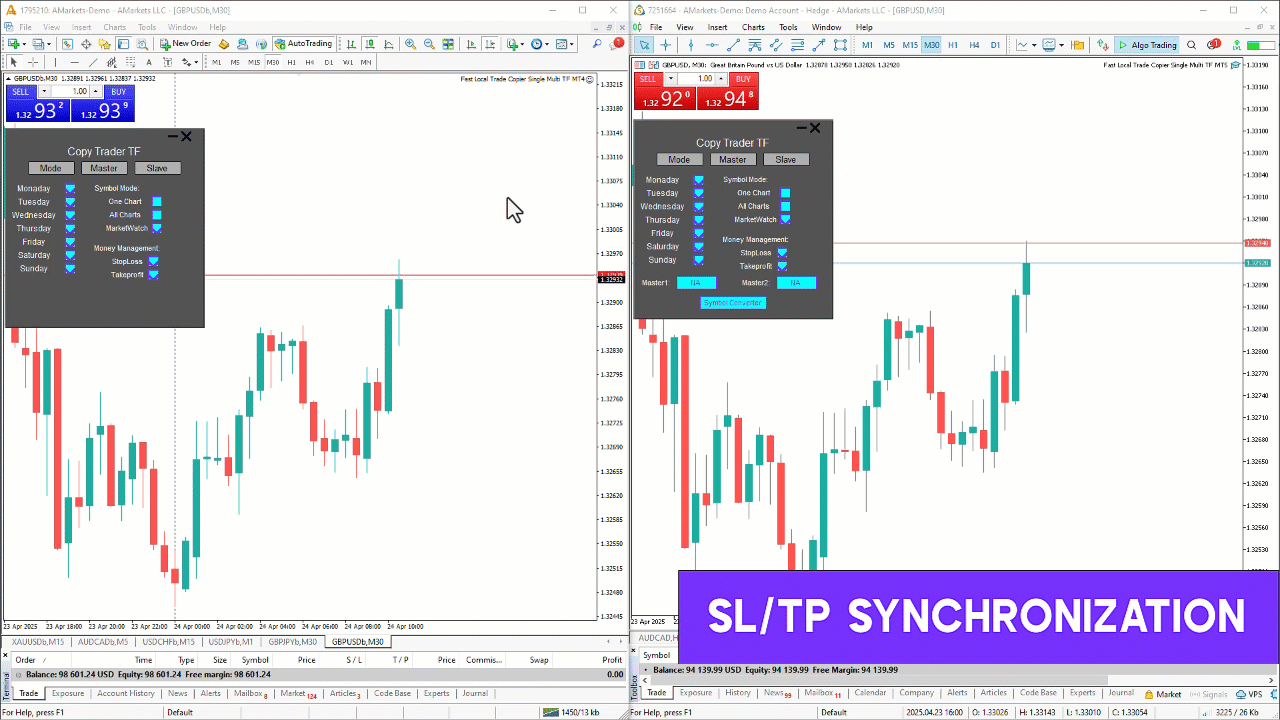 わずかな操作で、トレーダーは新規注文のエントリー、ストップロス(SL)、テイクプロフィット(TP)、および利益確定レベルを、マスター口座からスレーブ口座へ即座に複製できます。遅延を排し、一貫性のあるトレード管理を可能にします。