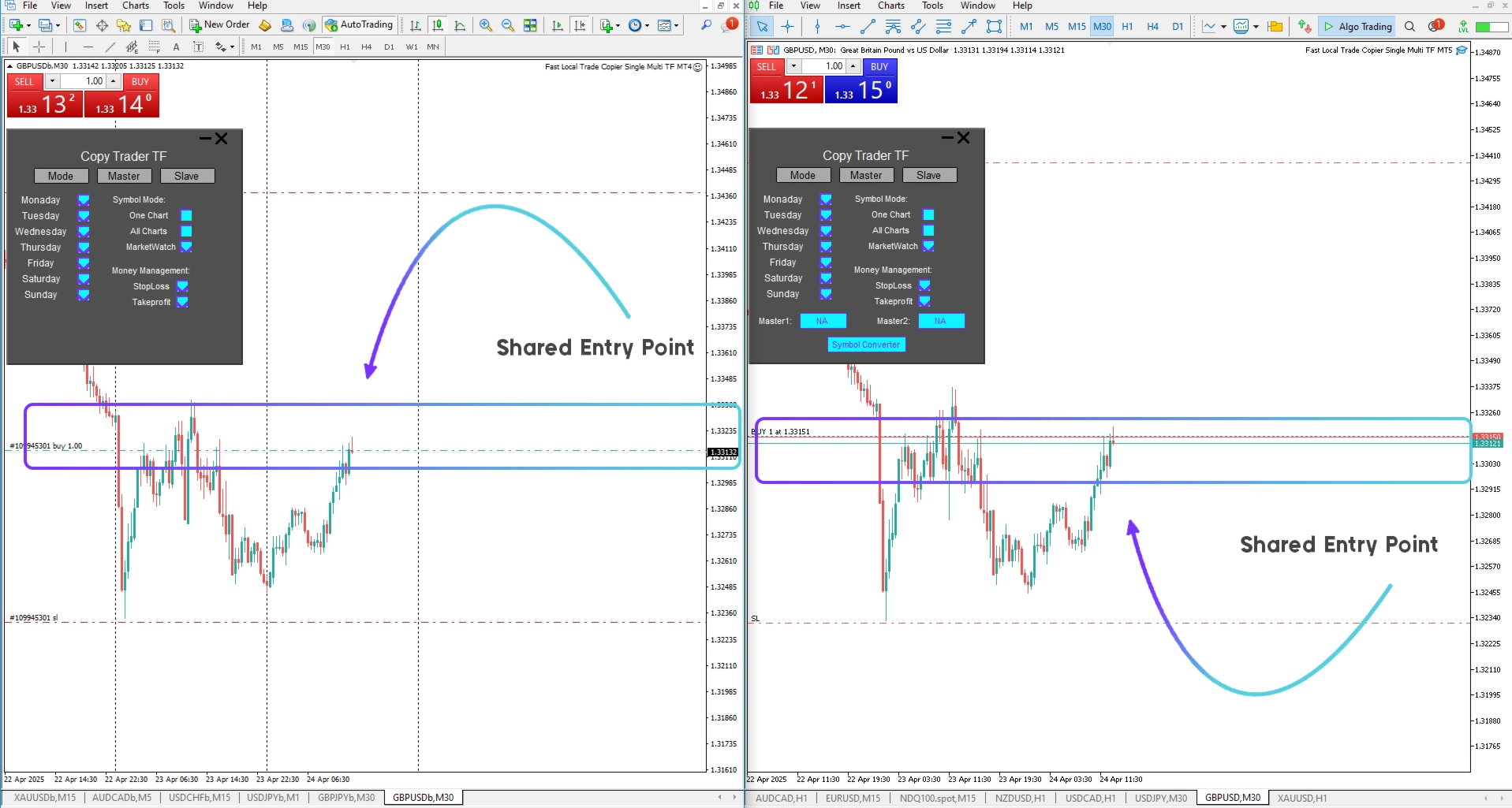 GBP/USDチャートで、マスター口座にて買いポジションを発注し、SLとTPを設定。これらのパラメータは瞬時にスレーブ口座へコピーされ、両口座の取引内容が完全に一致します。