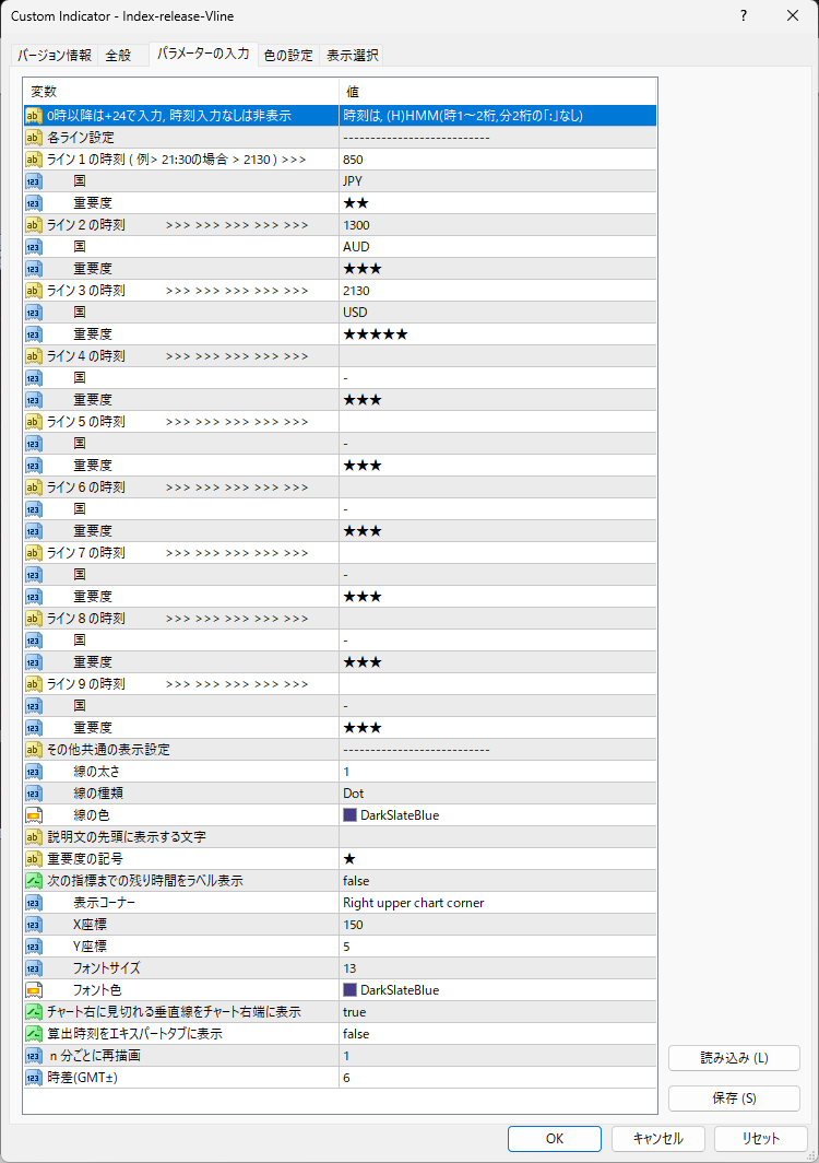 チャート上の指標発表時刻に垂直線を表示します。 指標の情報はインジケーターの設定画面より手入力で行います。