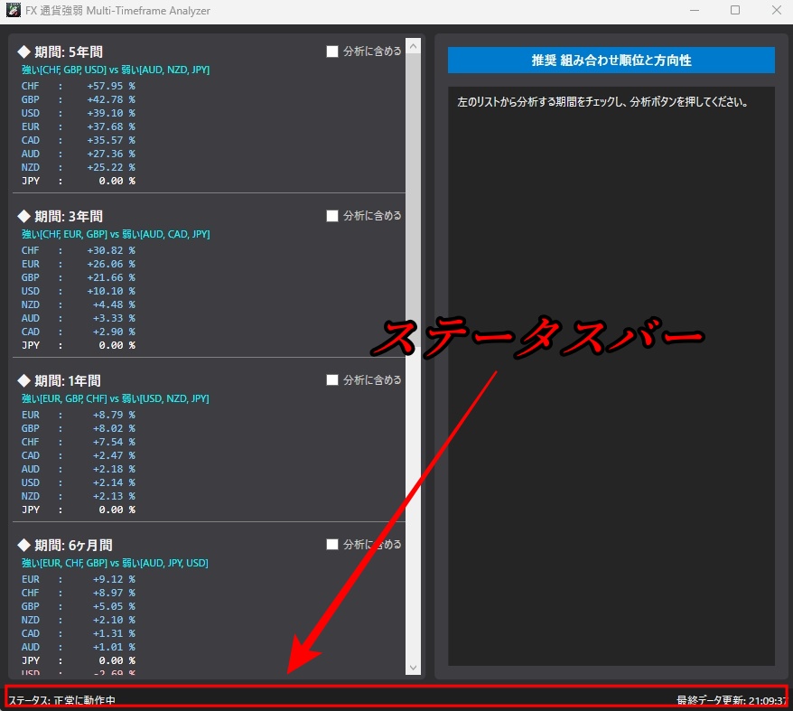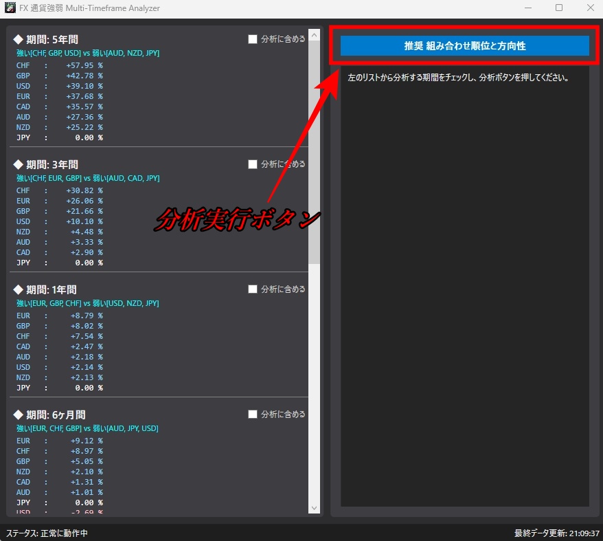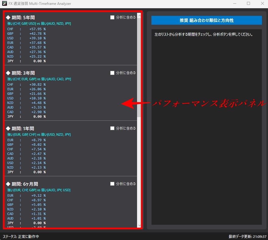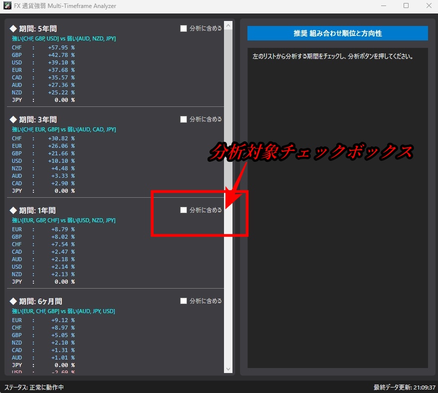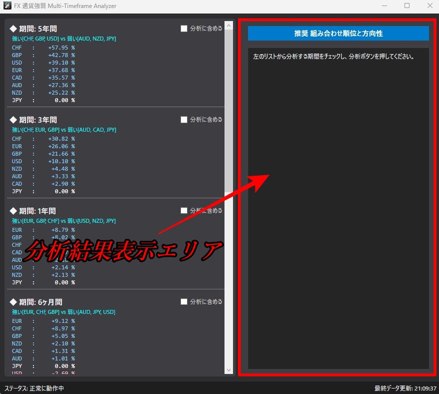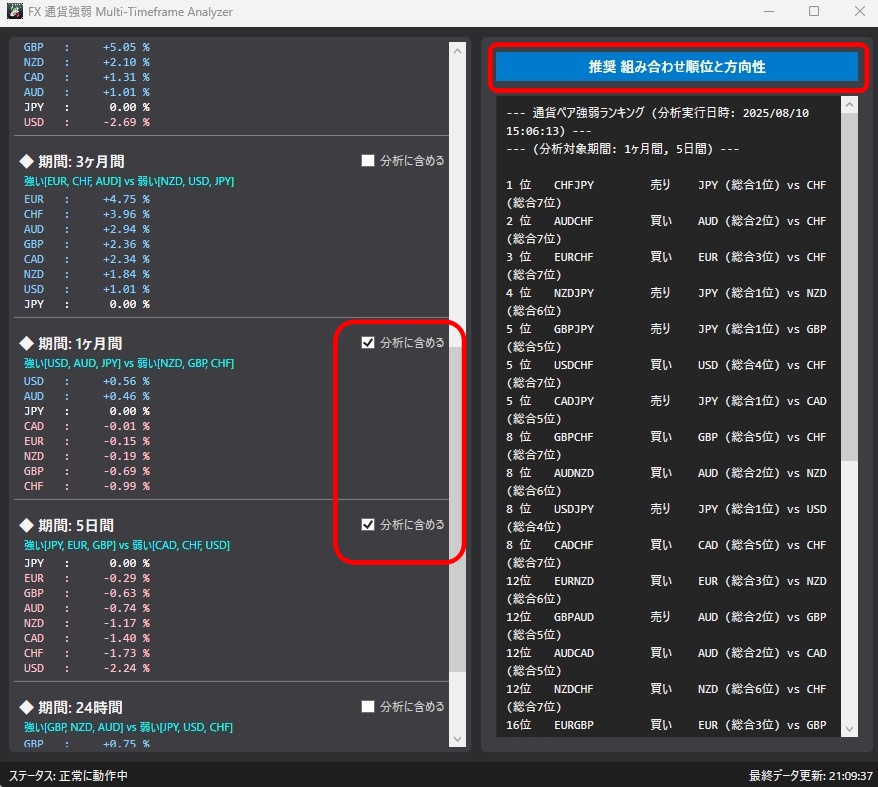 [推奨 組み合わせ順位と方向性] をクリックします。 - 右側のエリアに、分析結果が表示されます。