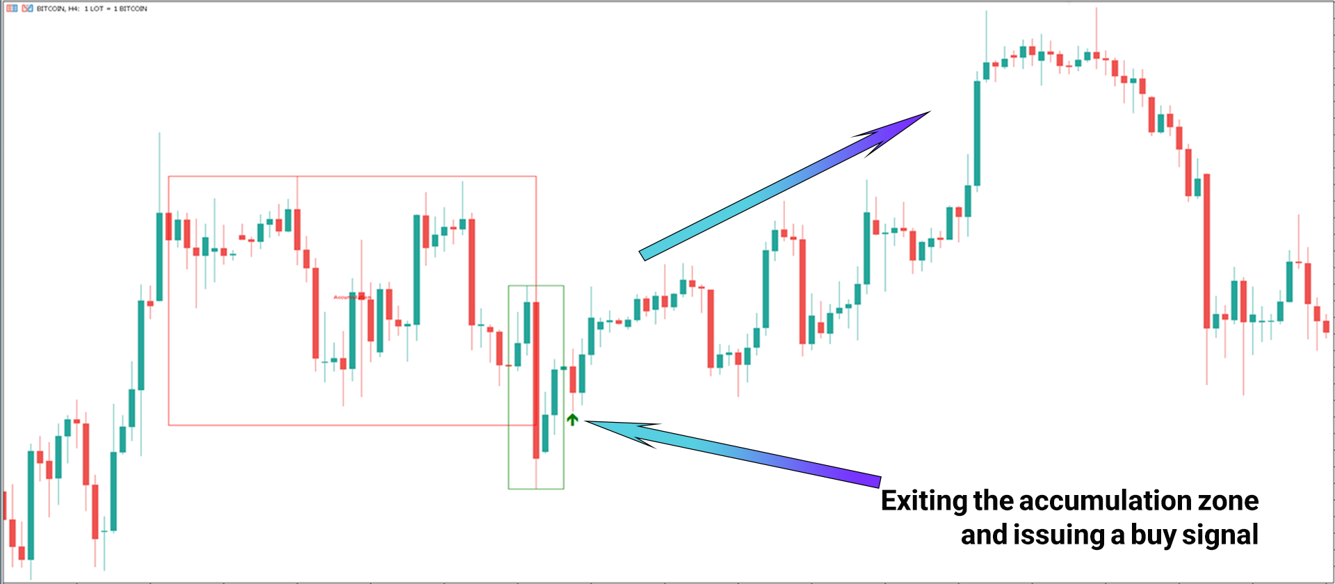 そのレンジを価格がブレイクすると、市場は操作フェーズに移行し、自動的に買い(ロング)シグナルが発生します。