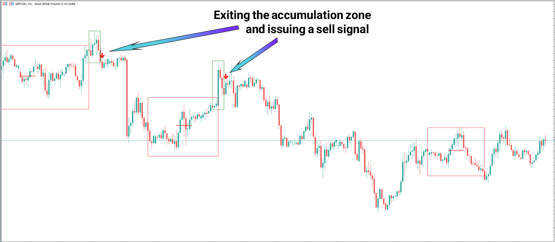 4時間足のGBP/USDチャートでは、価格が緑色の操作ゾーンを抜けた際に赤い矢印が表示されます。