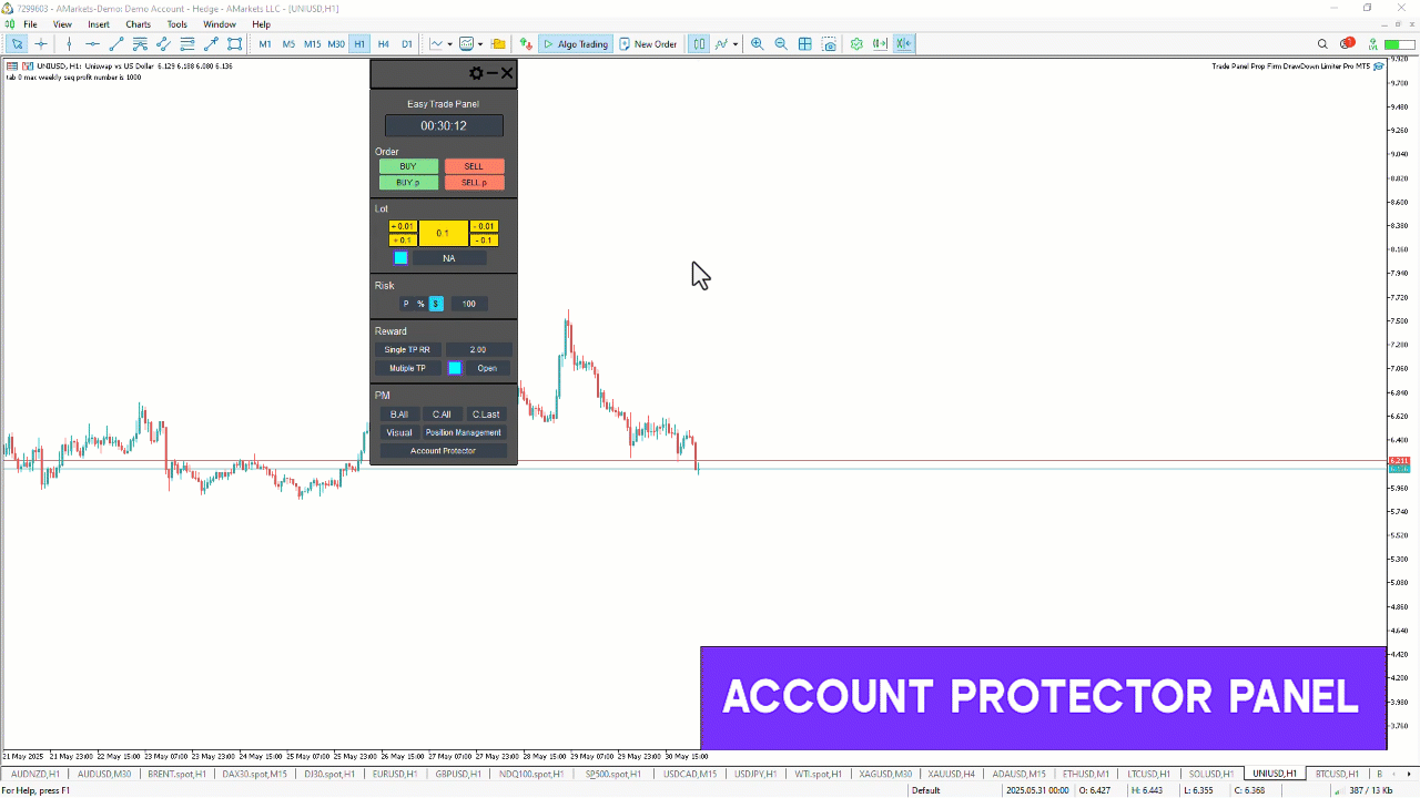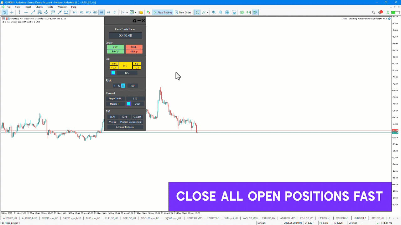 このパネルを使えば、ナスダック30分足チャート上で即座にブレークイーブン設定、部分決済、全決済をワンクリックで実行可能です。リアルタイムの指標(注文タイプ、ロット数、損益、リスクリワード比)を専用のトレードボックスに表示し、迅速かつ自信を持った判断をサポートします。