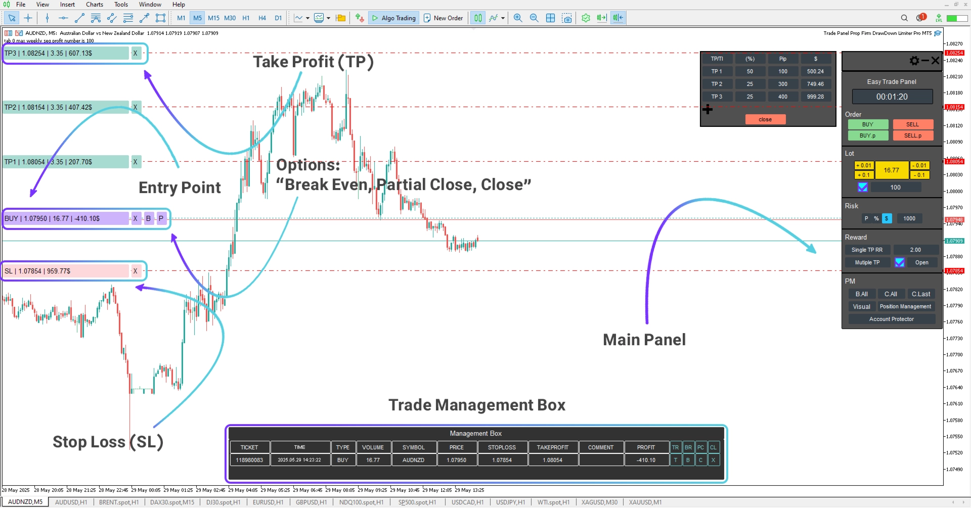 その中心にはProp Account Protector Expert Advisorℴがあり、複数シンボル対応のモジュール式ツールで、ストップロス(SL)、テイクプロフィット(TP)、ブレークイーブン、部分決済の設定を迅速かつ直感的に行えます。