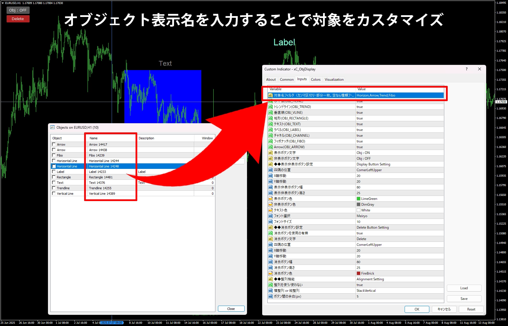 チャート上のオブジェクトをボタンで簡単に表示・非表示・消去