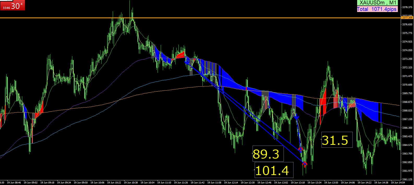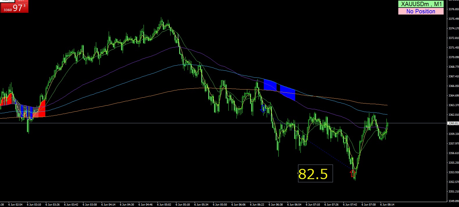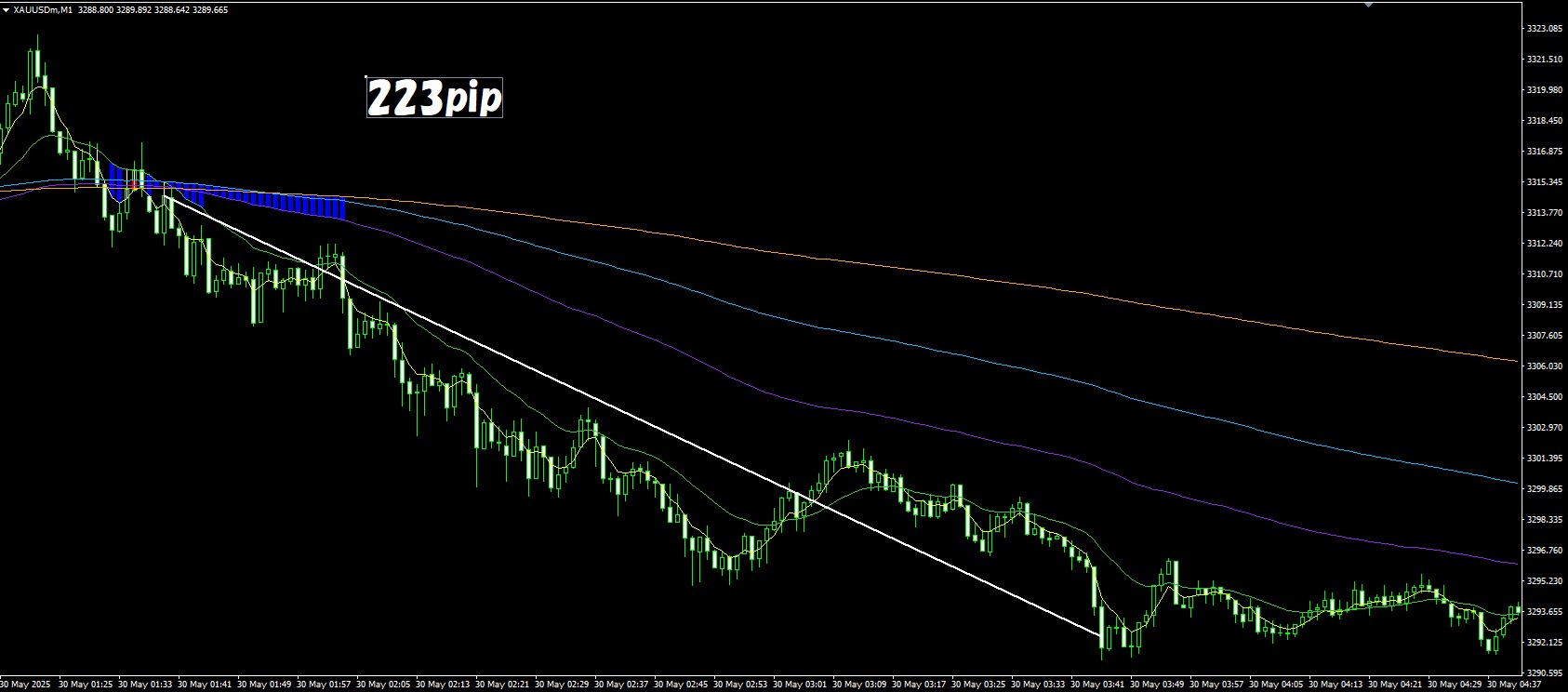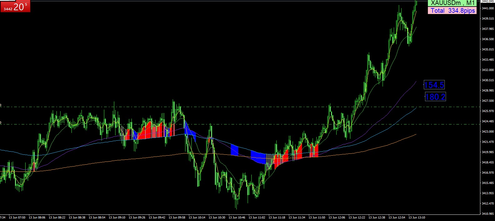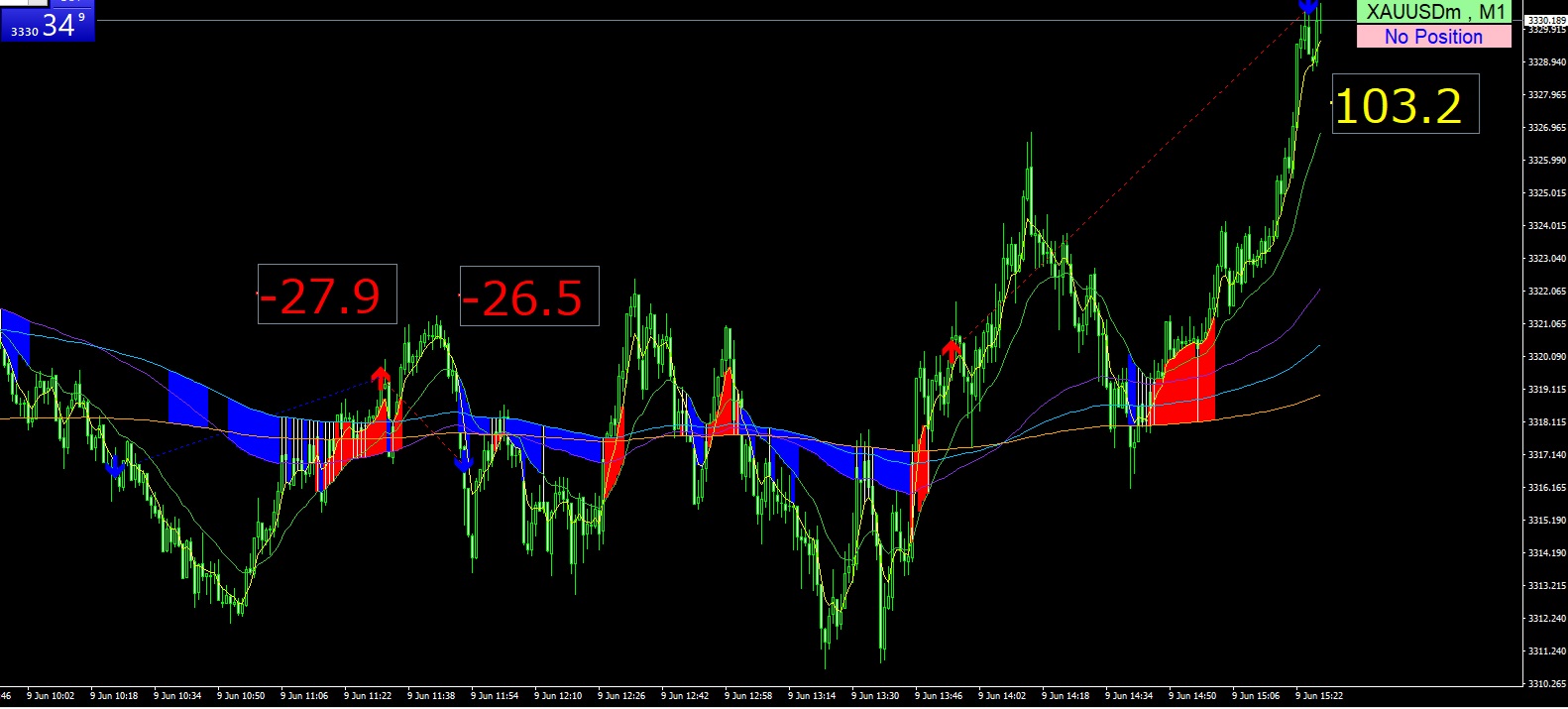 「Kintoun M1 Gold」は、5本の移動平均線が収束した瞬間を“雲”としてチャートに描画。