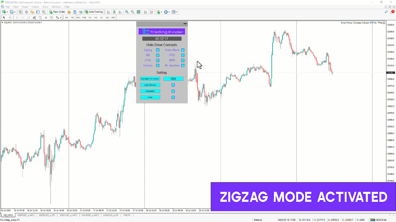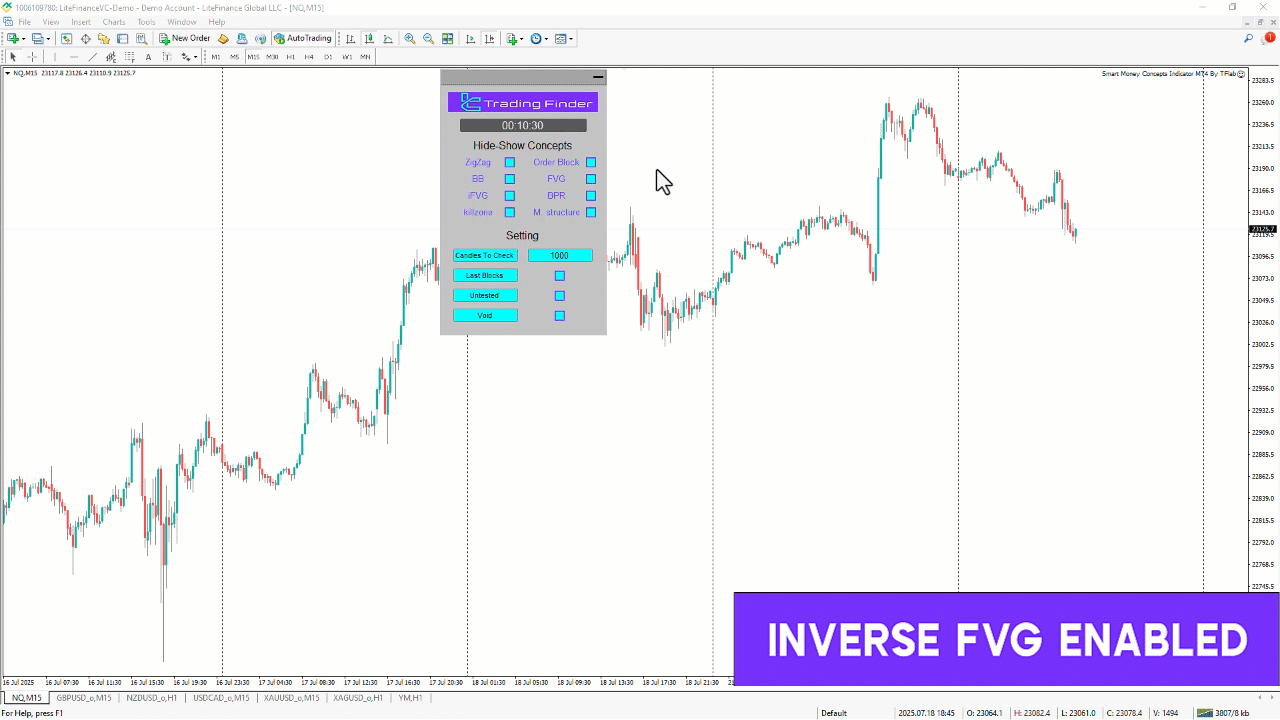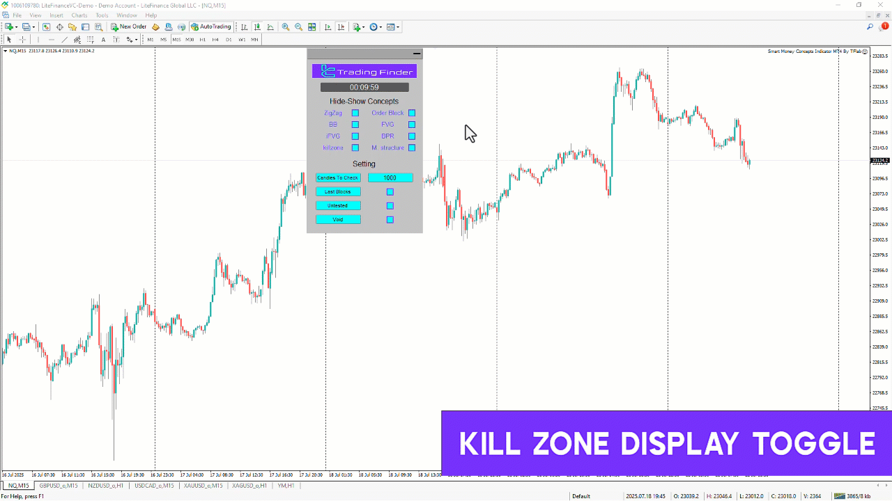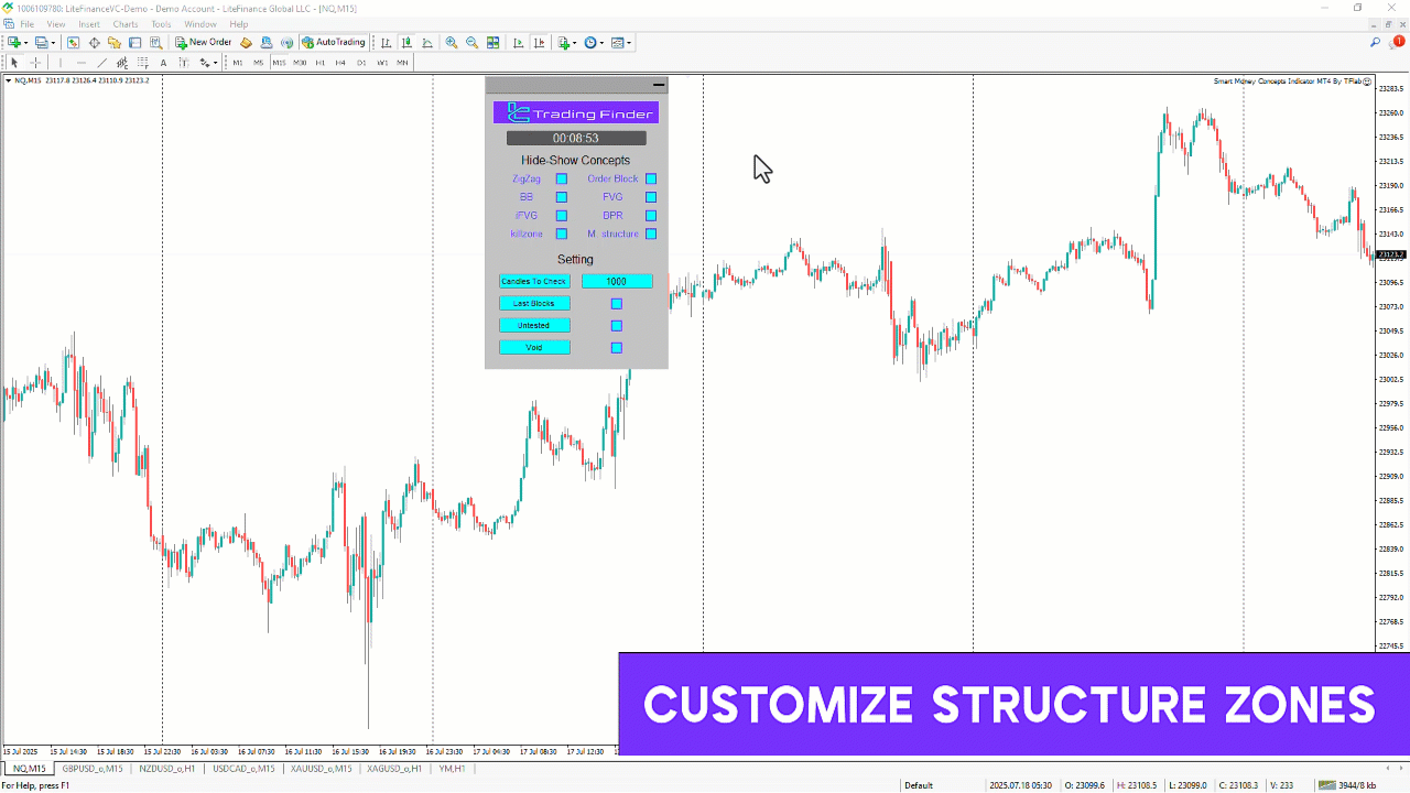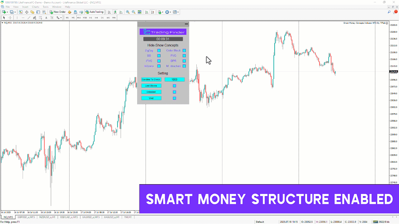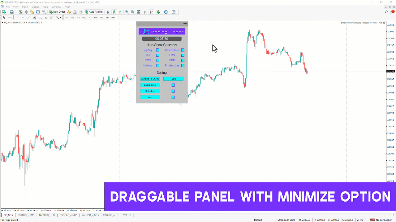 フローティングコントロールパネルにより、トレーダーはさまざまな市場構造コンポーネントの表示を簡単に管理できます。各機能は重要なスマートマネーの原則に基づいており、自動描画のオン・オフ切り替えや完全なカスタマイズが可能です。