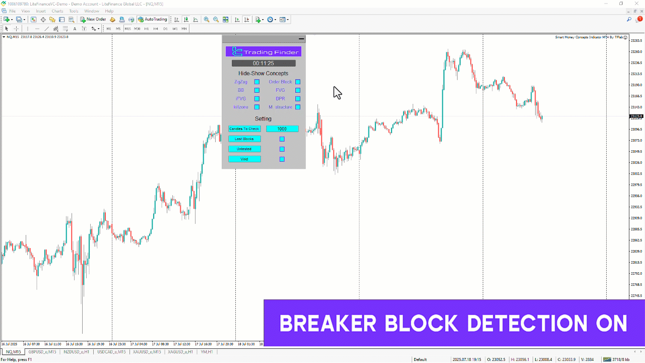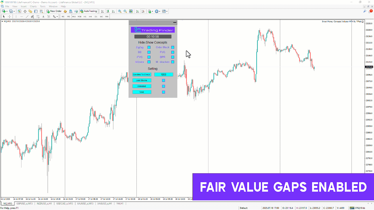 このエキスパートアドバイザーは、機関投資家のオーダーフローロジックと流動性ダイナミクスに基づいて構築されており、市場をリアルタイムでスキャンし、先進的な分析ビジュアルをチャートに重ねて表示します。スマートマネーの要素として構造ブレイク、オーダーブロック、フェアバリューギャップ(FVG)、流動性ゾーンを利用することで、市場構造や潜在的な価格反応について即座に洞察を得ることができます。
