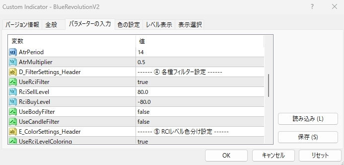 • UseRciFilter: RCIが指定レベルにある時のみサインを出すフィルターです。過熱圏での逆張りに有効です。