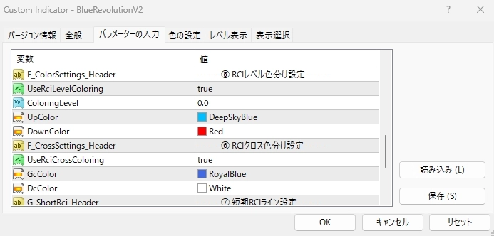 • UseRciCrossColoring: ONにすると、短期RCIと長期RCIのクロス状態に応じて長期RCIが色付けされます。