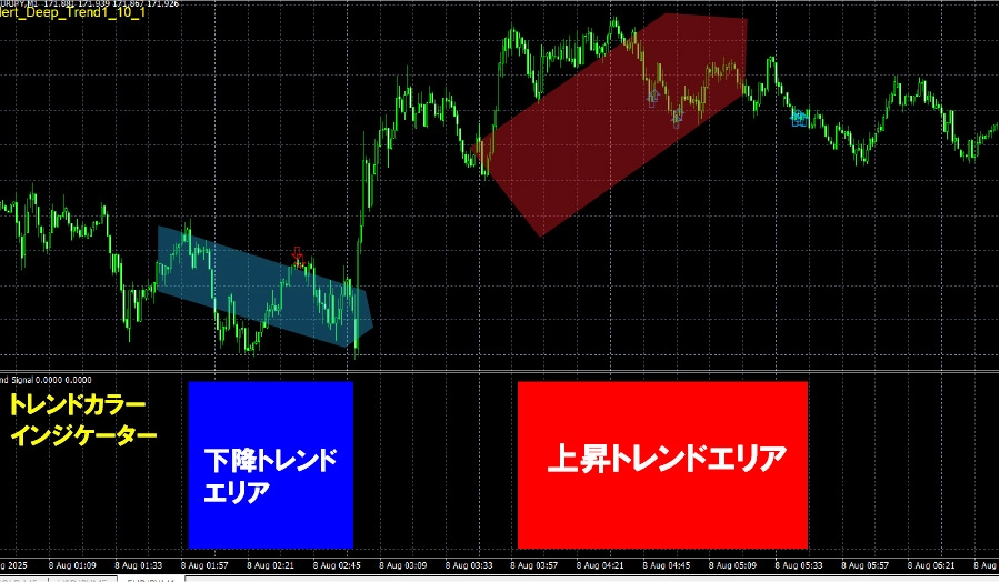 - 指定時間足でトレンドが発生すると、サブウィンドウに色が表示されます。