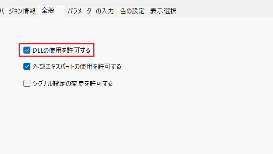 ダウンロード後、本ツールをお好きな時間足に適用し、「全般」タブの「DLLの使用を許可する」にチェック