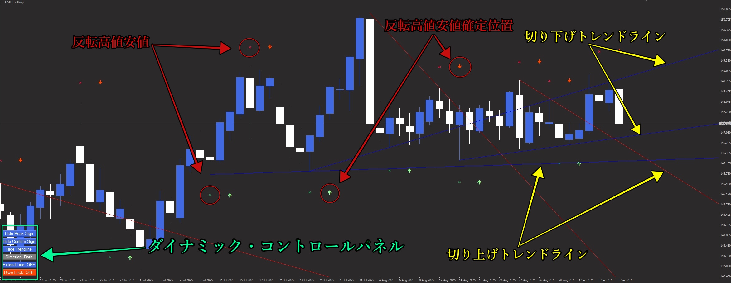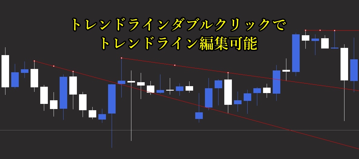 上の画像のように、ロック中にトレンドラインをダブルクリックすると、ラインが選択状態になり自由に編集できます。自動描画された客観的なラインを"たたき台"として、あなたの分析に合わせて角度や位置を微調整してください。これは、自動分析の客観性と、熟練トレーダーの裁量を完璧に融合させる、まさに次世代の機能です。