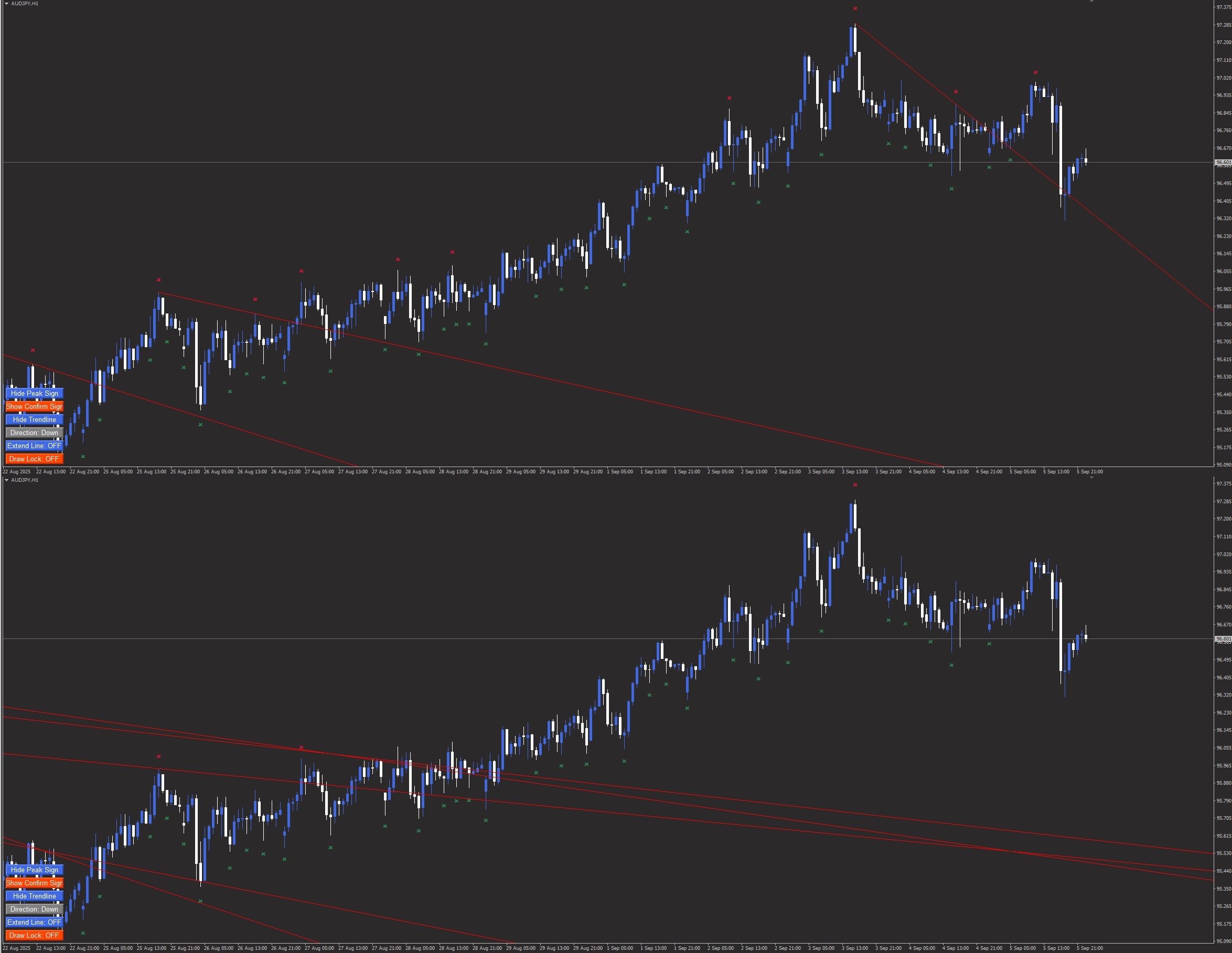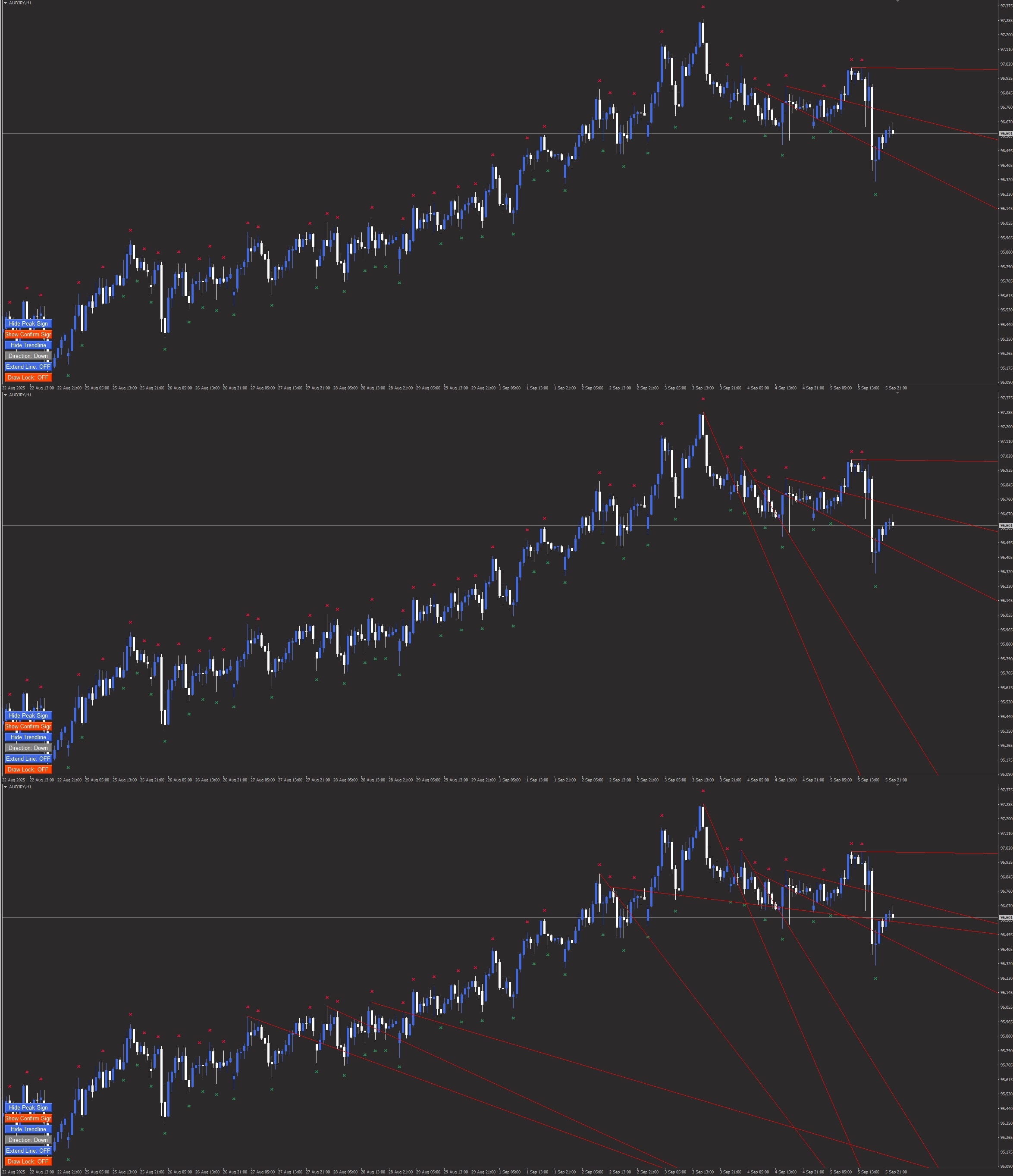 フラクタル構造に基づき、厳選されたスイングハイ同士・スイングロー同士を自動で結びつけます。描画するラインの本数(`MaxTrendlines`)もパラメータで自由に調整可能。下の画像は、トレンドラインの最大描画本数を上段で2本、下段で5本に設定した際の比較です。本数を増やすことでより多角的な分析も行えます。