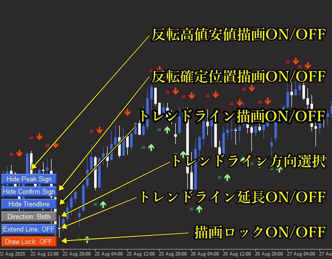 インジケーターは、もはや「従う」ものではなく「使いこなす」ものへ。新搭載の「Draw Lock」ボタンは、インジケーターとトレーダーの関係を劇的に進化させます。ボタンをONにするとラインの自動更新が停止し、あなたの裁量分析のステージが始まります。