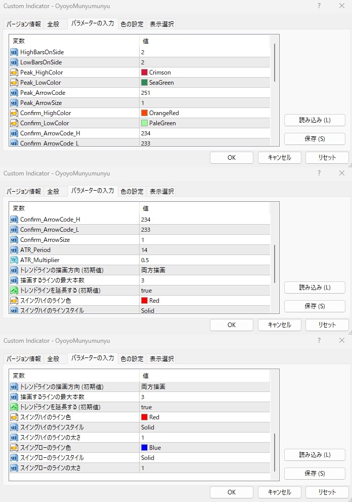 インジケーターをチャートに適用する際、以下の項目を詳細にカスタマイズできます。あなたのトレードスタイルに合わせて最適化してください。