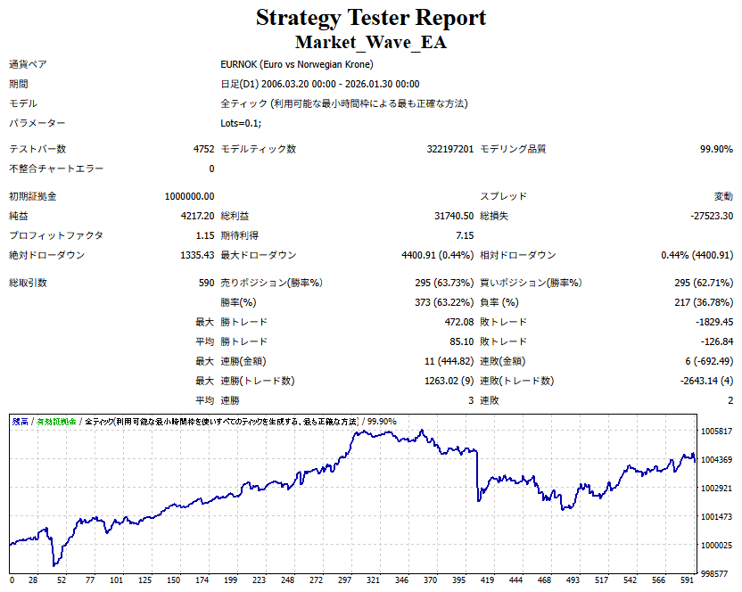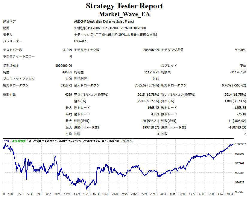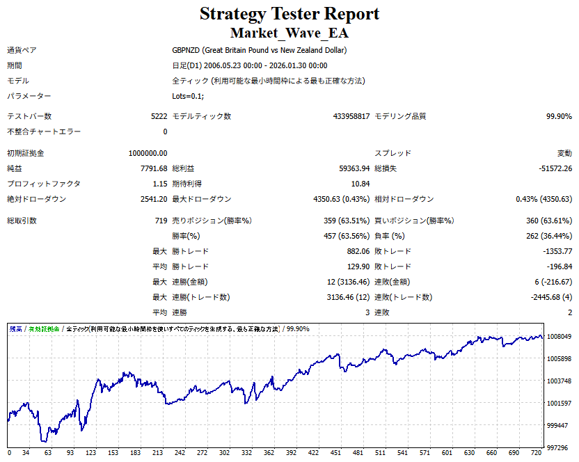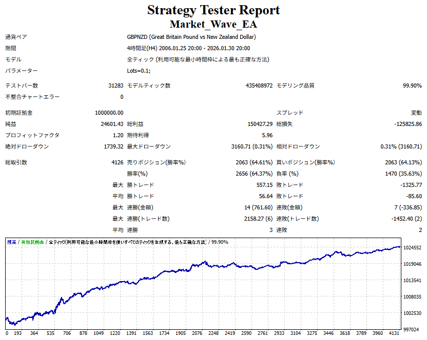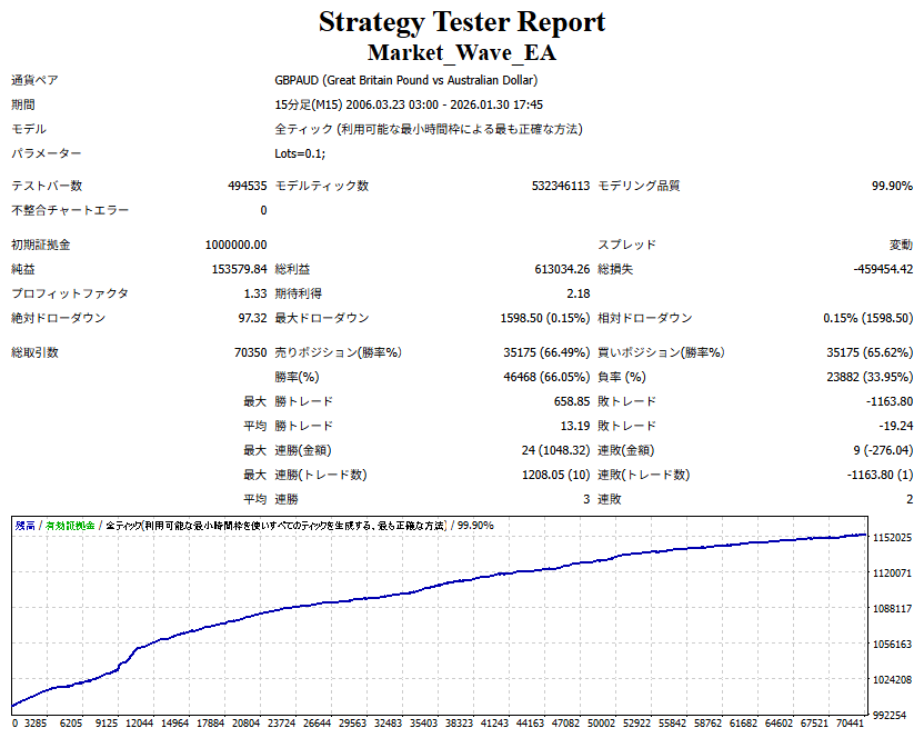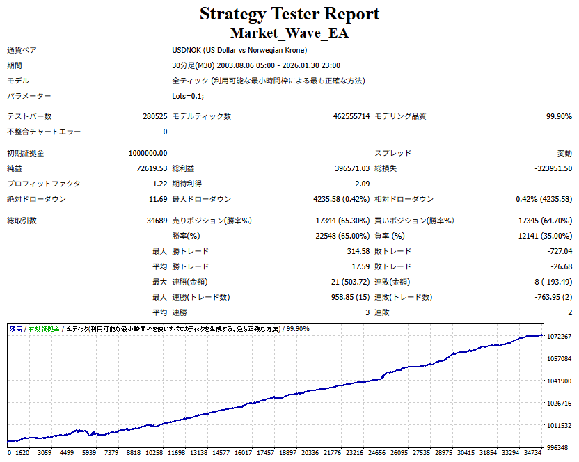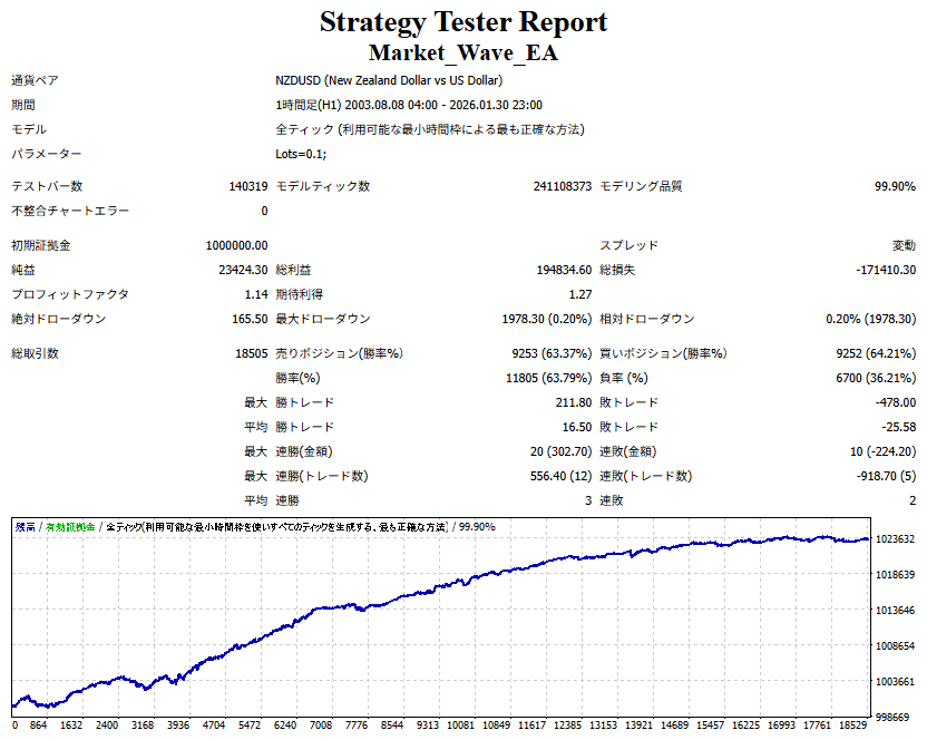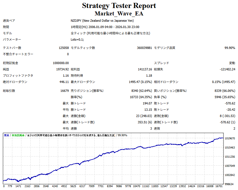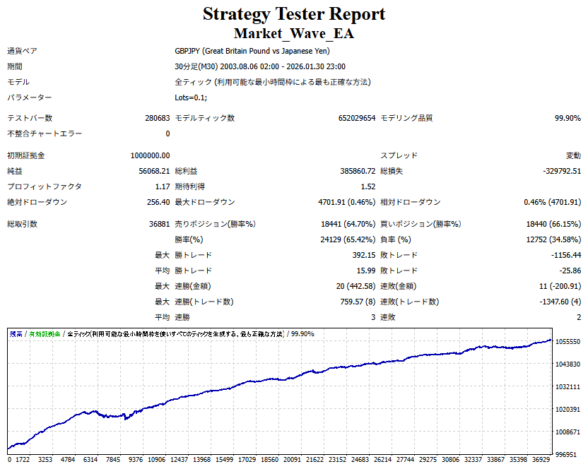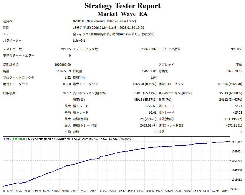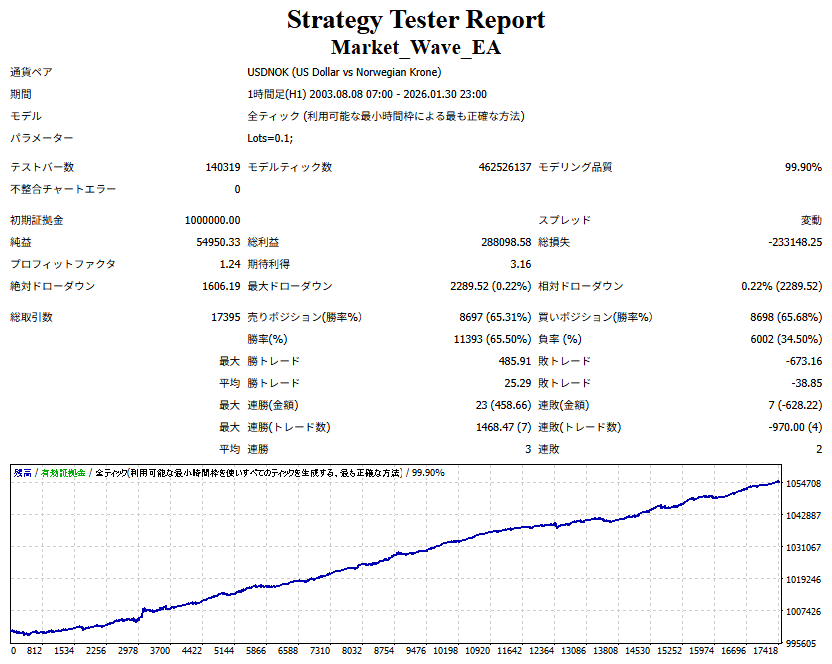 Market_Wave(バージョン:1.10 / 更新日:2025-09-25) ①「矢印サインの向きを “逆” に表示する機能」を実装しました。 ・ この機能を「true」に設定すると、矢印サインの向きが反転して表示されます。 ・ アラートおよびメール送信機能を「true」に設定している場合、通知に「Reverse」の文字が追加されます。 ・ パフォーマンスを外部出力する機能を「true」に設定している場合、すべての損益を反転して計算します。 ②「パフォーマンスを外部出力する機能」を実装しました。 ・ スプレッドは計算に含まれません。 ・ 過去チャートに既に表示されているサインは対象外で、新規に出現するサインのみが対象です。 ・ 通貨ペアなど銘柄ごとの損益計算は複雑なため、損益は「ポイント」で出力します。 ・ 出力ファイルは「Quant Analyzer 4」で読み込めるHTML形式で生成されます。 ・「Quant Analyzer 4」は無料版(バージョン4.9.2)の利用を推奨します。Pro版での対応可否は不明です。 ・「リアルチャート」や練行足などの「オフラインチャート」によるフォワードテスト、 ならびにストラテジーテスターによる「バックテスト」での出力にも対応しています。 ※ 出力ファイルの保存先は以下のとおりです。 ・「リアルチャート」「オフラインチャート」での出力時: データフォルダを開く → MQL4 → Files フォルダ ・ ストラテジーテスターによる「バックテスト」での出力時: データフォルダを開く → tester → files フォルダ ※【注意】 出力を終了する際は、サインインジケーターがファイルを保持しているため解放が必要です。 パフォーマンスを外部出力する機能を「false」に切り替えるか、開いているチャートを閉じてください。 ③ 練行足などの「オフラインチャート」で矢印サインが出現した際、アラートおよびメール送信機能が正しく動作するよう修正しました。