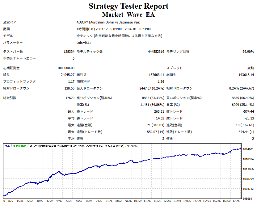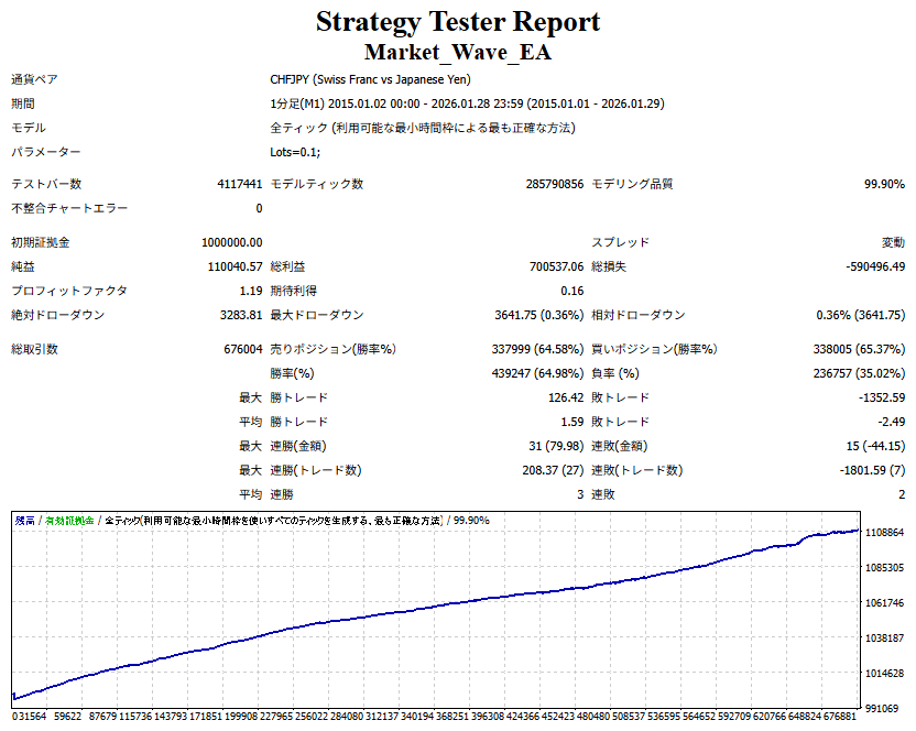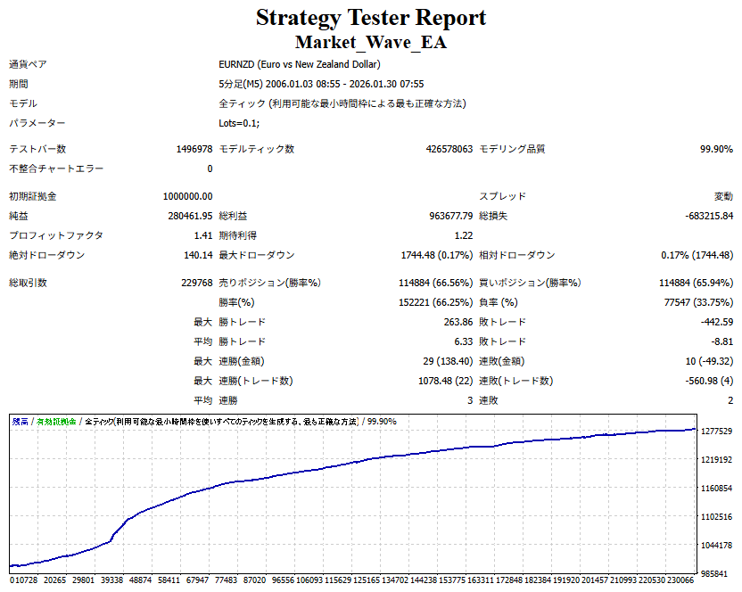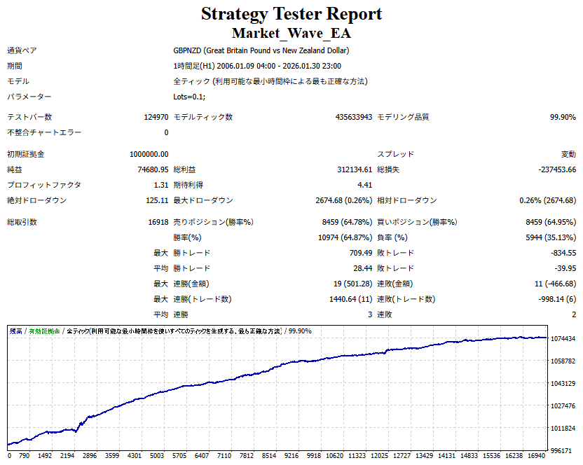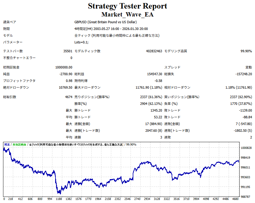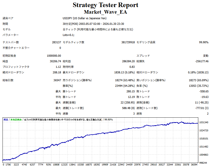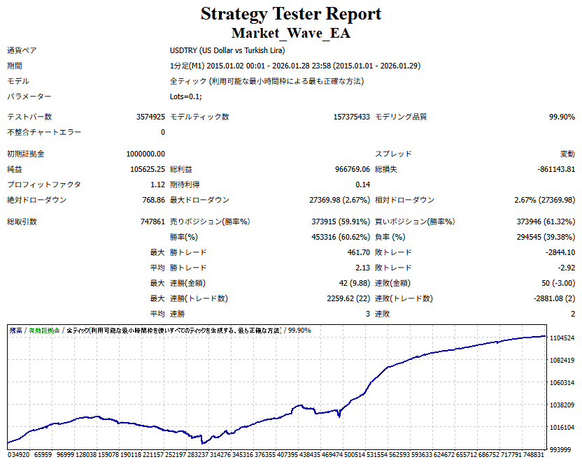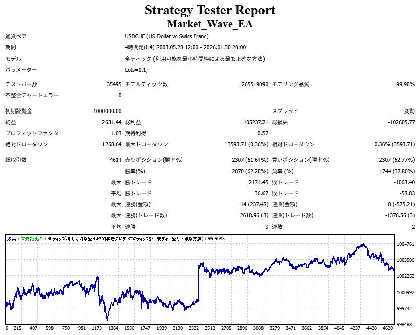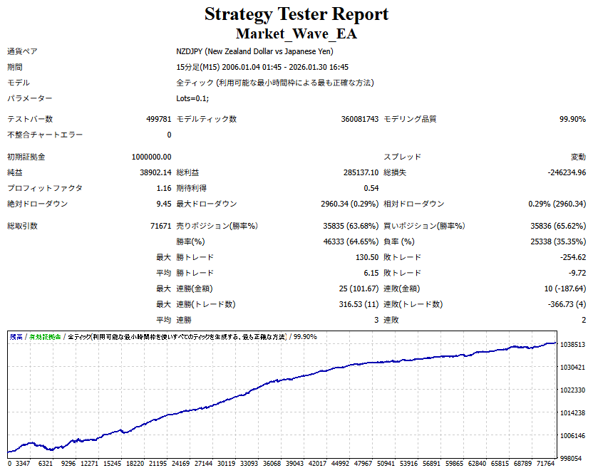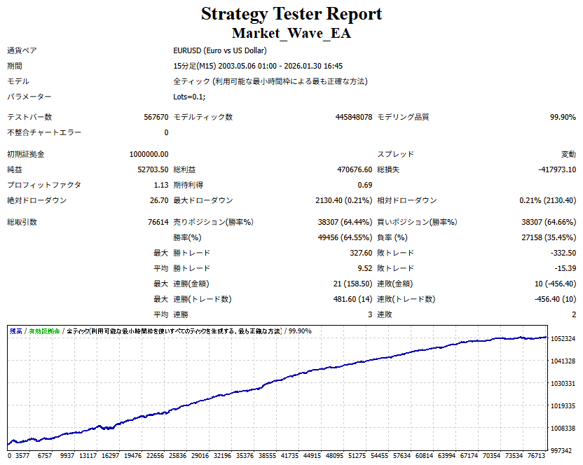 Market_Wave(バージョン:1.10 / 更新日:2025-09-25) ①「矢印サインの向きを “逆” に表示する機能」を実装しました。 ・ この機能を「true」に設定すると、矢印サインの向きが反転して表示されます。 ・ アラートおよびメール送信機能を「true」に設定している場合、通知に「Reverse」の文字が追加されます。 ・ パフォーマンスを外部出力する機能を「true」に設定している場合、すべての損益を反転して計算します。 ②「パフォーマンスを外部出力する機能」を実装しました。 ・ スプレッドは計算に含まれません。 ・ 過去チャートに既に表示されているサインは対象外で、新規に出現するサインのみが対象です。 ・ 通貨ペアなど銘柄ごとの損益計算は複雑なため、損益は「ポイント」で出力します。 ・ 出力ファイルは「Quant Analyzer 4」で読み込めるHTML形式で生成されます。 ・「Quant Analyzer 4」は無料版(バージョン4.9.2)の利用を推奨します。Pro版での対応可否は不明です。 ・「リアルチャート」や練行足などの「オフラインチャート」によるフォワードテスト、 ならびにストラテジーテスターによる「バックテスト」での出力にも対応しています。 ※ 出力ファイルの保存先は以下のとおりです。 ・「リアルチャート」「オフラインチャート」での出力時: データフォルダを開く → MQL4 → Files フォルダ ・ ストラテジーテスターによる「バックテスト」での出力時: データフォルダを開く → tester → files フォルダ ※【注意】 出力を終了する際は、サインインジケーターがファイルを保持しているため解放が必要です。 パフォーマンスを外部出力する機能を「false」に切り替えるか、開いているチャートを閉じてください。 ③ 練行足などの「オフラインチャート」で矢印サインが出現した際、アラートおよびメール送信機能が正しく動作するよう修正しました。