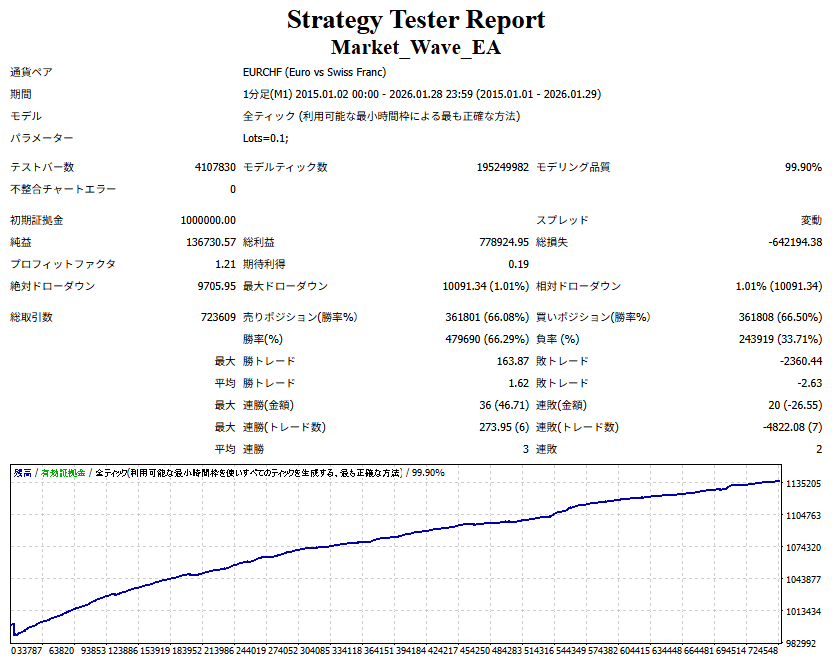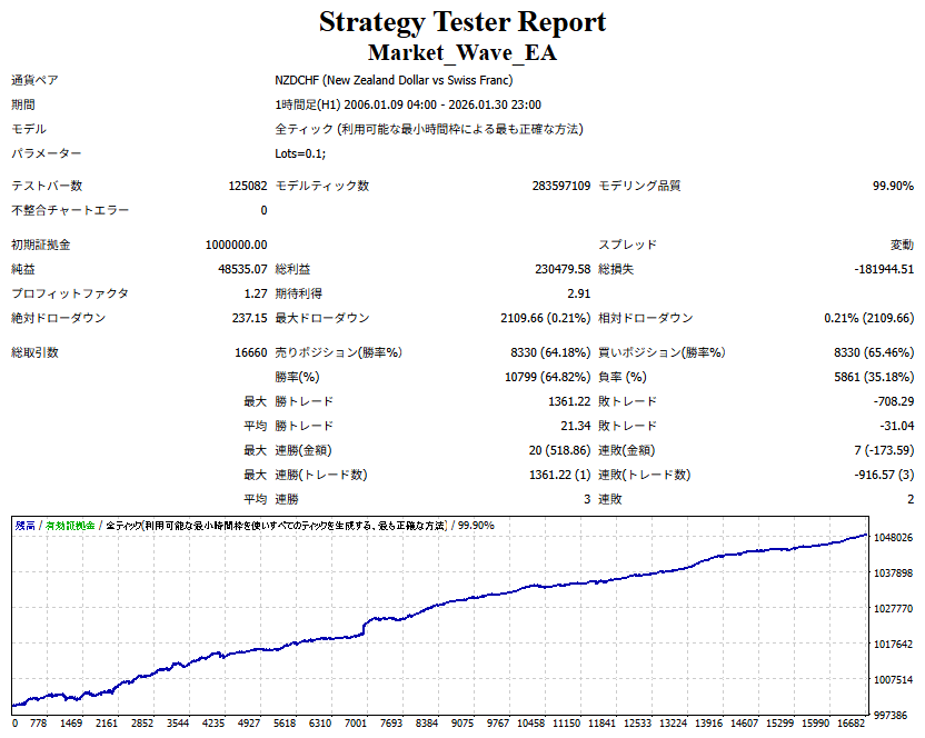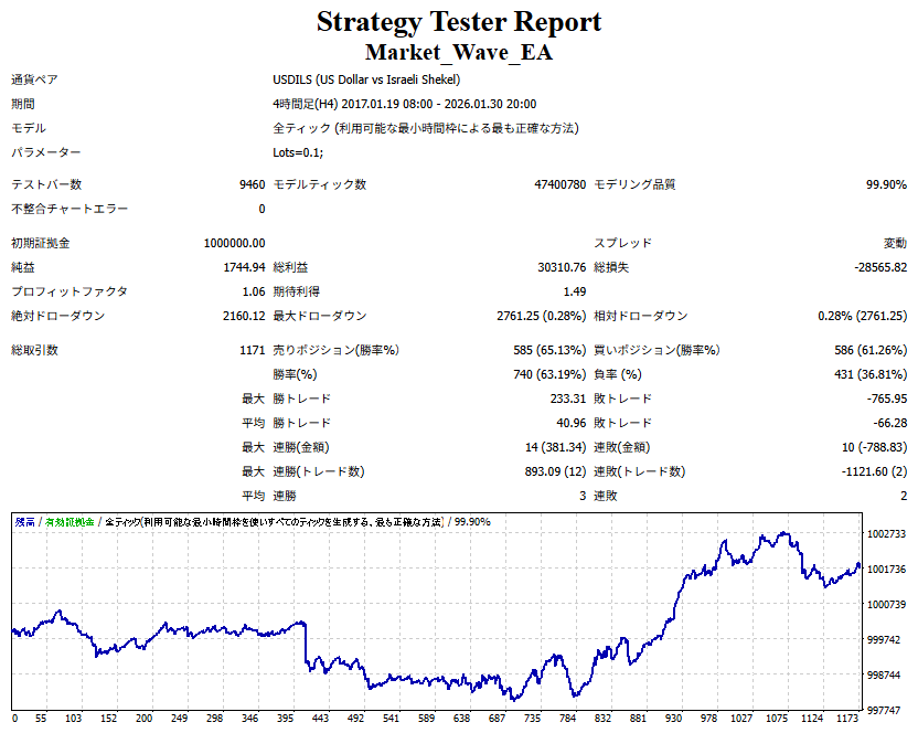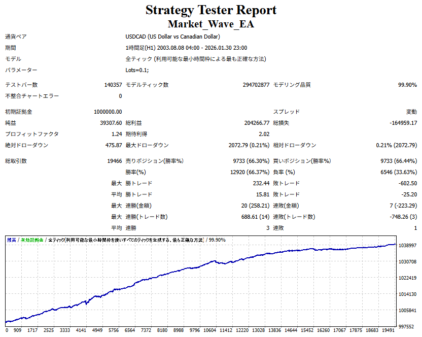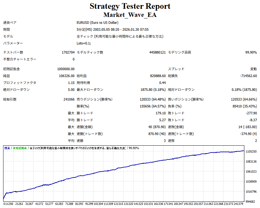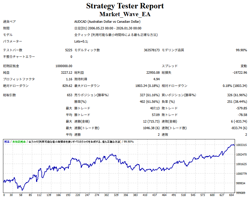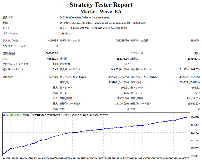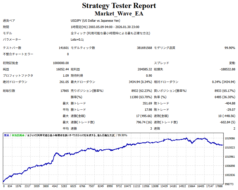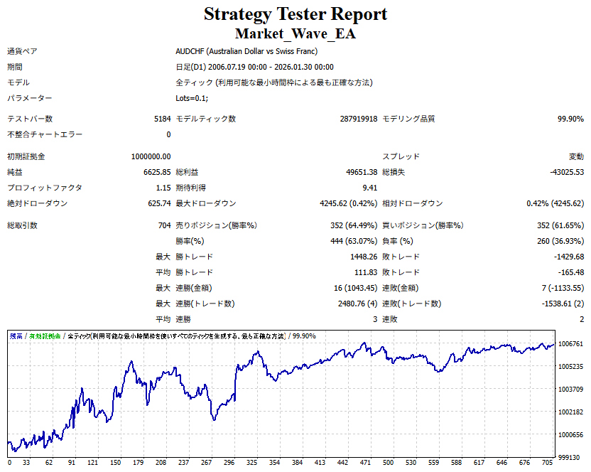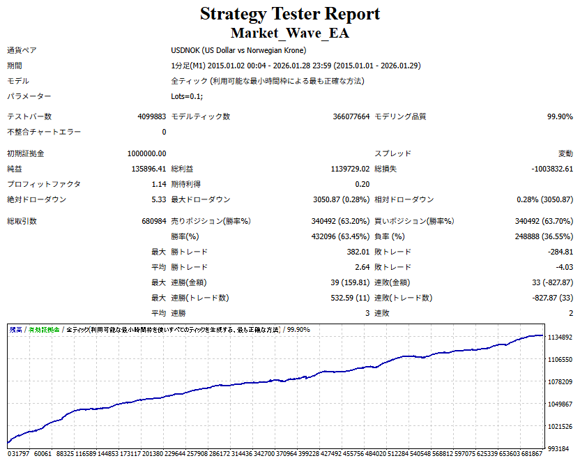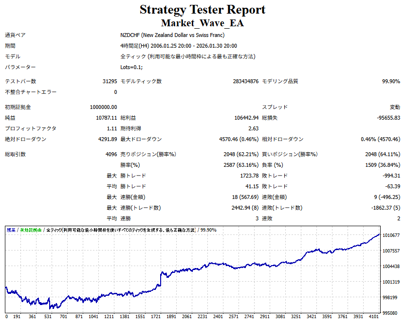 Market_Wave(バージョン:1.10 / 更新日:2025-09-25) ①「矢印サインの向きを “逆” に表示する機能」を実装しました。 ・ この機能を「true」に設定すると、矢印サインの向きが反転して表示されます。 ・ アラートおよびメール送信機能を「true」に設定している場合、通知に「Reverse」の文字が追加されます。 ・ パフォーマンスを外部出力する機能を「true」に設定している場合、すべての損益を反転して計算します。 ②「パフォーマンスを外部出力する機能」を実装しました。 ・ スプレッドは計算に含まれません。 ・ 過去チャートに既に表示されているサインは対象外で、新規に出現するサインのみが対象です。 ・ 通貨ペアなど銘柄ごとの損益計算は複雑なため、損益は「ポイント」で出力します。 ・ 出力ファイルは「Quant Analyzer 4」で読み込めるHTML形式で生成されます。 ・「Quant Analyzer 4」は無料版(バージョン4.9.2)の利用を推奨します。Pro版での対応可否は不明です。 ・「リアルチャート」や練行足などの「オフラインチャート」によるフォワードテスト、 ならびにストラテジーテスターによる「バックテスト」での出力にも対応しています。 ※ 出力ファイルの保存先は以下のとおりです。 ・「リアルチャート」「オフラインチャート」での出力時: データフォルダを開く → MQL4 → Files フォルダ ・ ストラテジーテスターによる「バックテスト」での出力時: データフォルダを開く → tester → files フォルダ ※【注意】 出力を終了する際は、サインインジケーターがファイルを保持しているため解放が必要です。 パフォーマンスを外部出力する機能を「false」に切り替えるか、開いているチャートを閉じてください。 ③ 練行足などの「オフラインチャート」で矢印サインが出現した際、アラートおよびメール送信機能が正しく動作するよう修正しました。