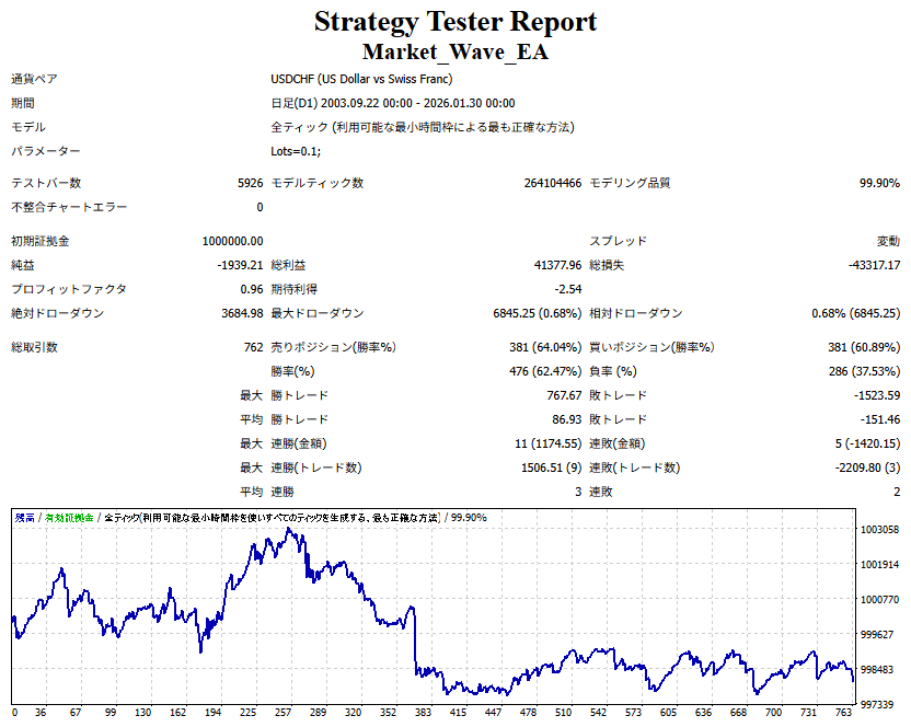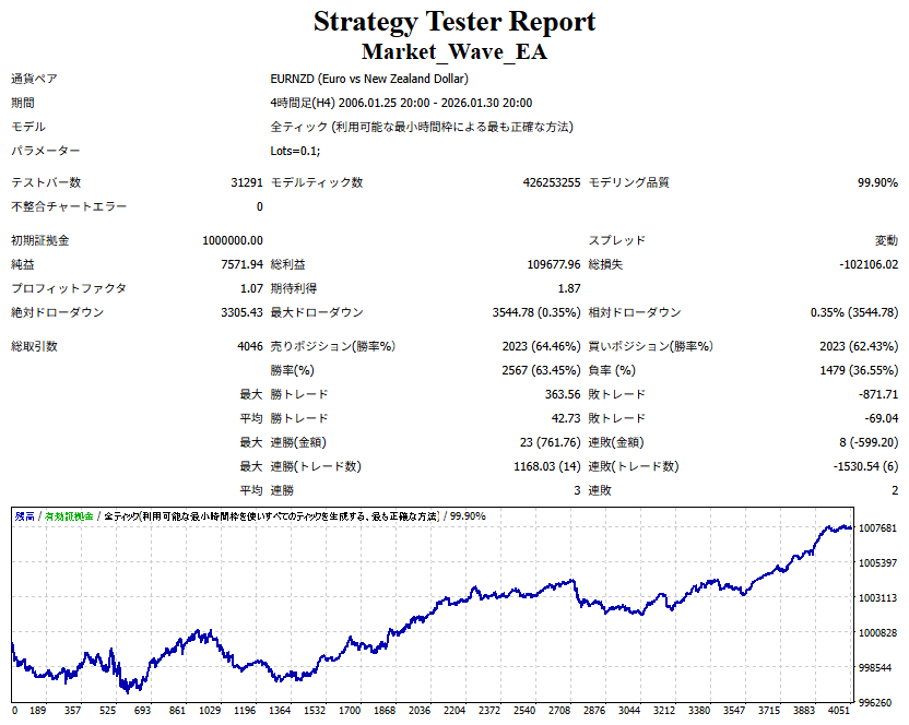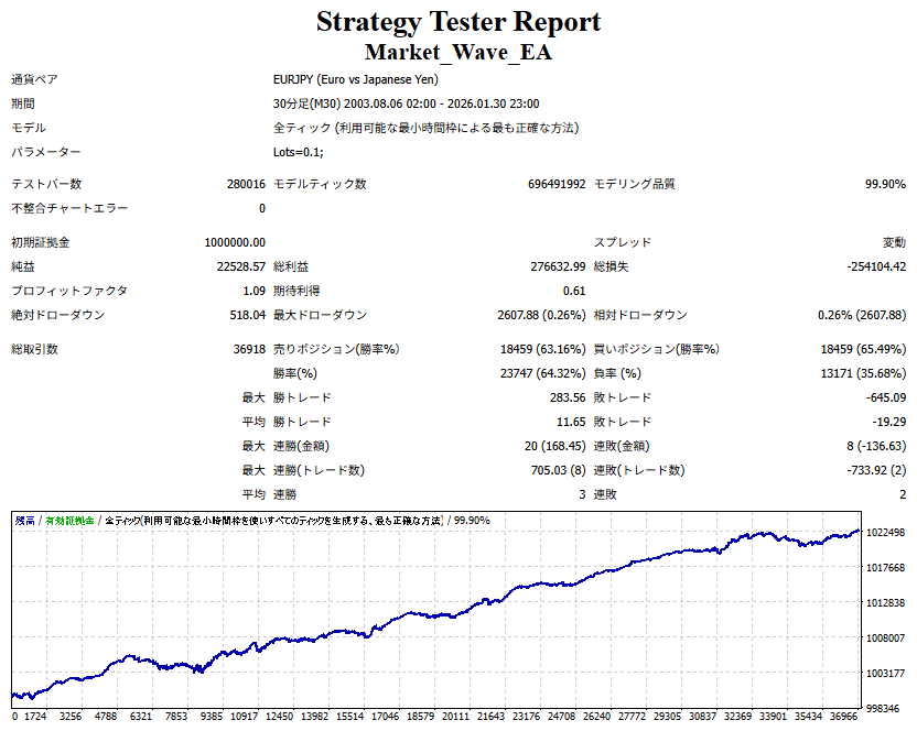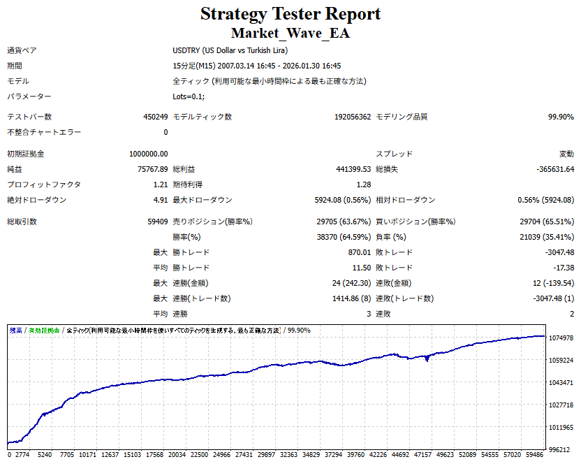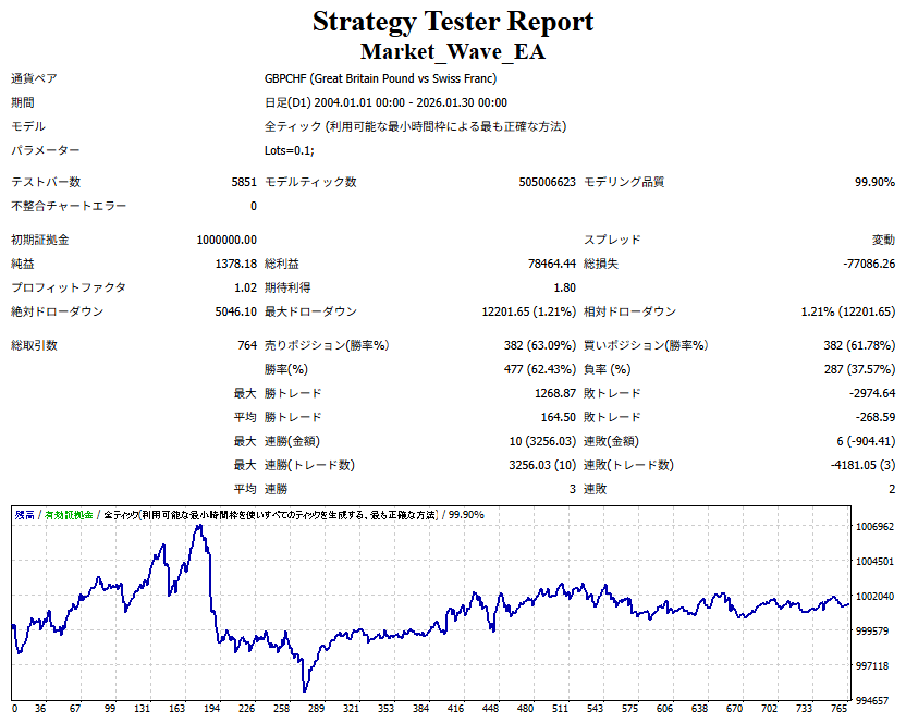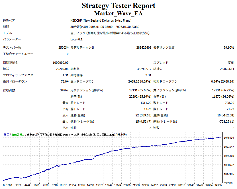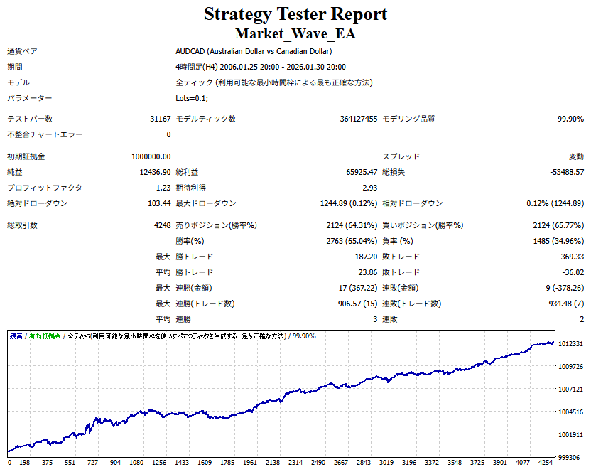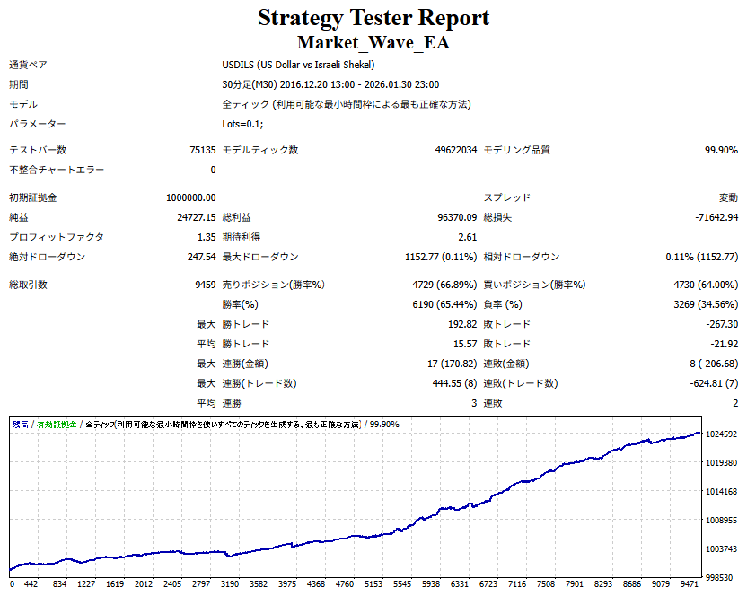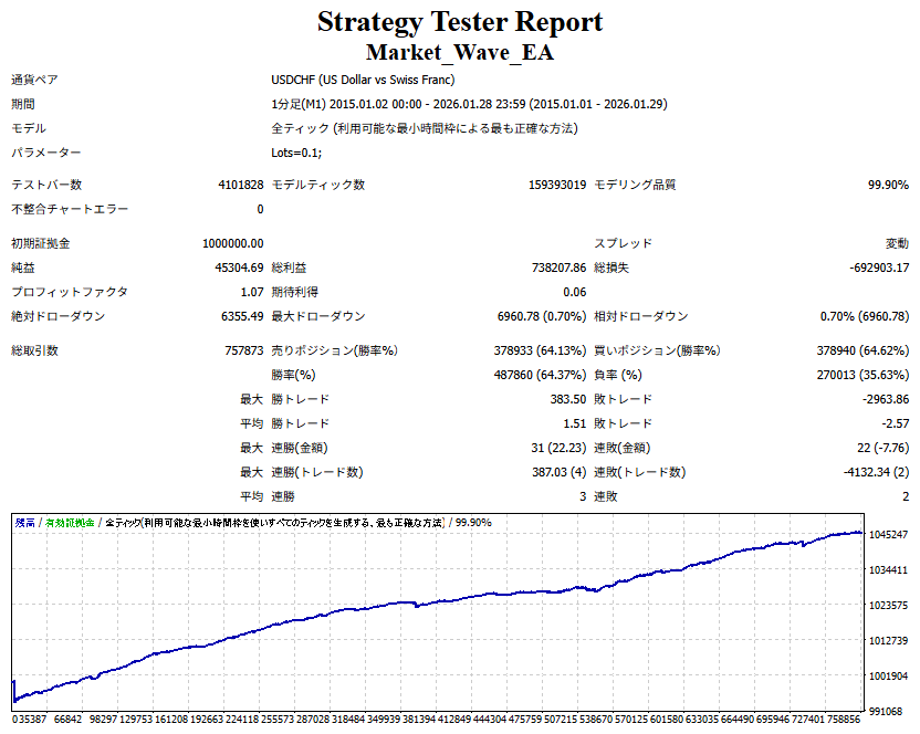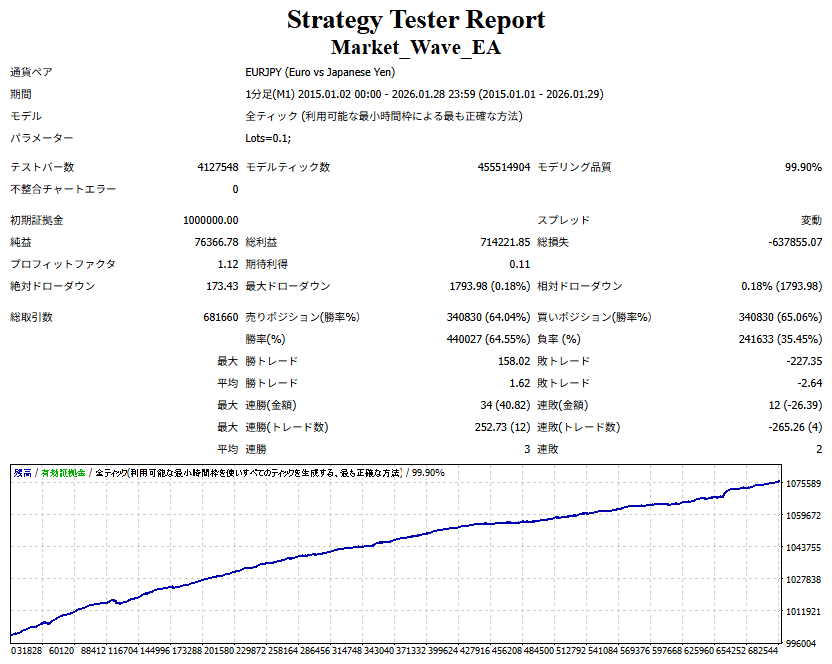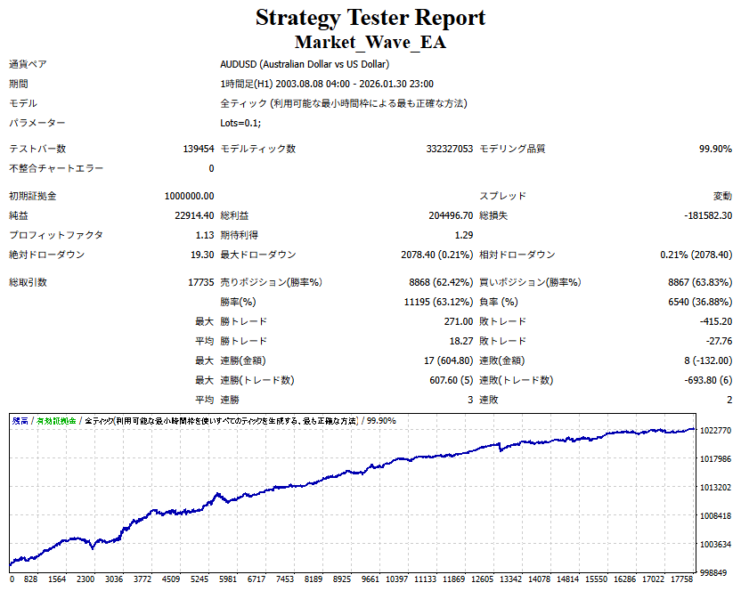 Market_Wave(バージョン:1.10 / 更新日:2025-09-25) ①「矢印サインの向きを “逆” に表示する機能」を実装しました。 ・ この機能を「true」に設定すると、矢印サインの向きが反転して表示されます。 ・ アラートおよびメール送信機能を「true」に設定している場合、通知に「Reverse」の文字が追加されます。 ・ パフォーマンスを外部出力する機能を「true」に設定している場合、すべての損益を反転して計算します。 ②「パフォーマンスを外部出力する機能」を実装しました。 ・ スプレッドは計算に含まれません。 ・ 過去チャートに既に表示されているサインは対象外で、新規に出現するサインのみが対象です。 ・ 通貨ペアなど銘柄ごとの損益計算は複雑なため、損益は「ポイント」で出力します。 ・ 出力ファイルは「Quant Analyzer 4」で読み込めるHTML形式で生成されます。 ・「Quant Analyzer 4」は無料版(バージョン4.9.2)の利用を推奨します。Pro版での対応可否は不明です。 ・「リアルチャート」や練行足などの「オフラインチャート」によるフォワードテスト、 ならびにストラテジーテスターによる「バックテスト」での出力にも対応しています。 ※ 出力ファイルの保存先は以下のとおりです。 ・「リアルチャート」「オフラインチャート」での出力時: データフォルダを開く → MQL4 → Files フォルダ ・ ストラテジーテスターによる「バックテスト」での出力時: データフォルダを開く → tester → files フォルダ ※【注意】 出力を終了する際は、サインインジケーターがファイルを保持しているため解放が必要です。 パフォーマンスを外部出力する機能を「false」に切り替えるか、開いているチャートを閉じてください。 ③ 練行足などの「オフラインチャート」で矢印サインが出現した際、アラートおよびメール送信機能が正しく動作するよう修正しました。