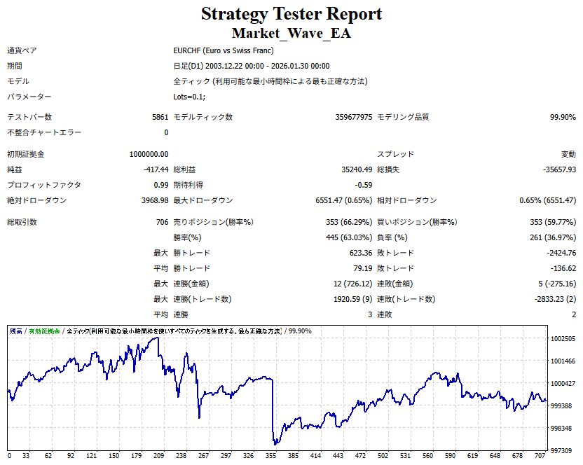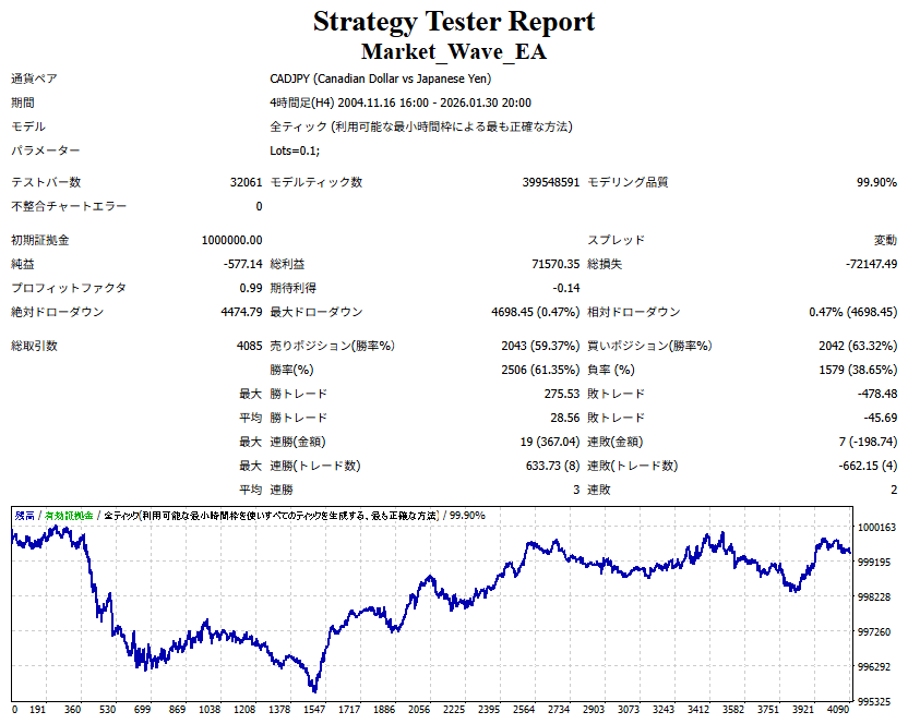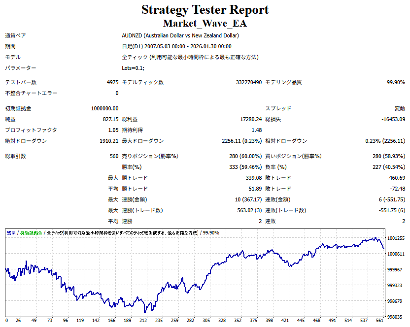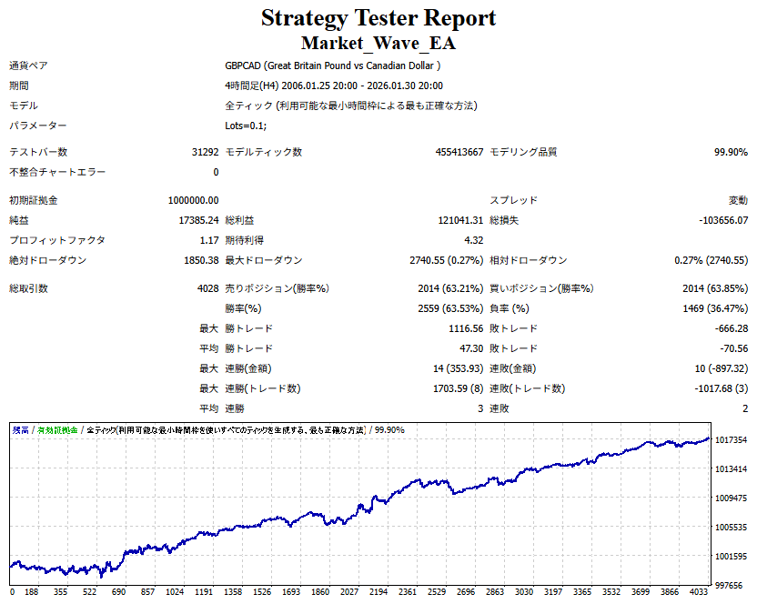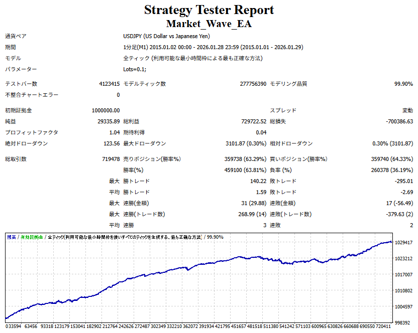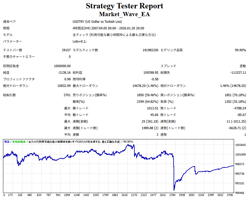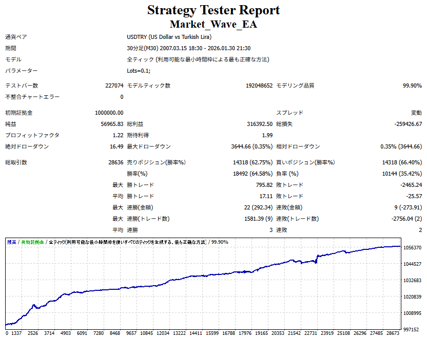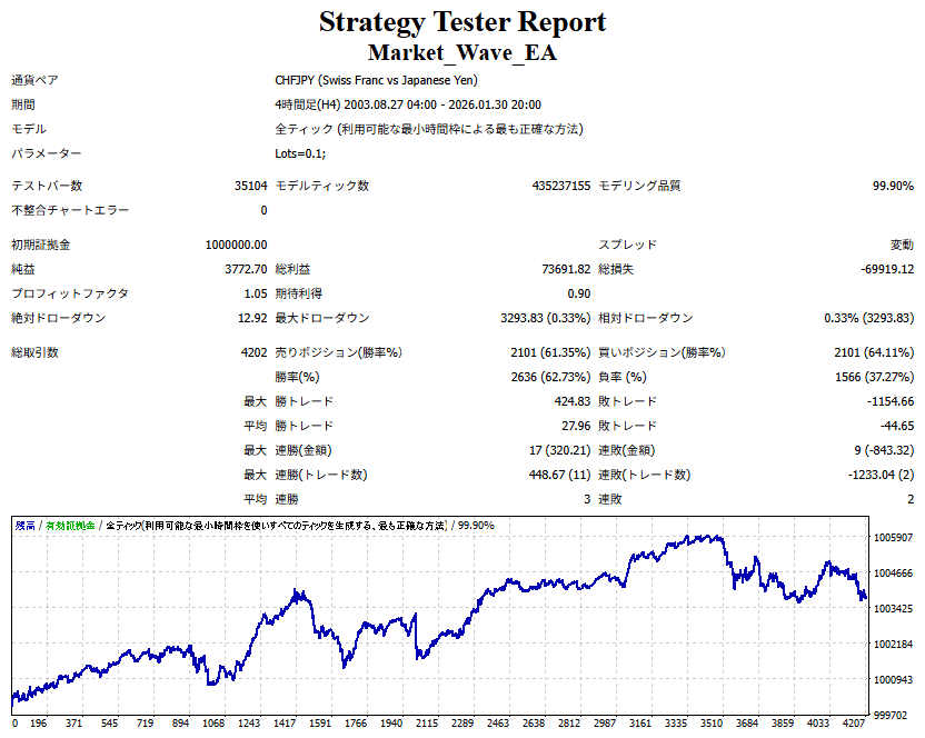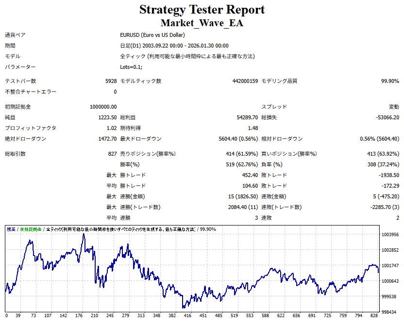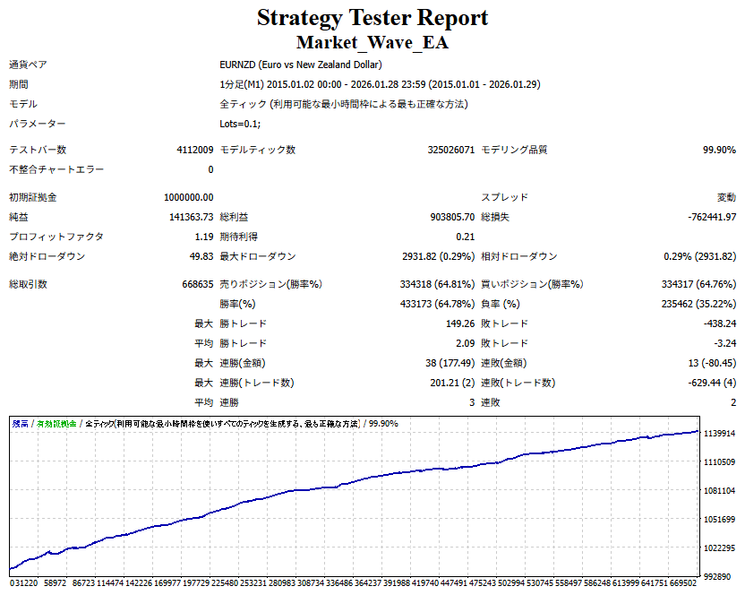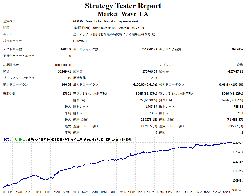Market_Wave(バージョン:1.10 / 更新日:2025-09-25) ①「矢印サインの向きを “逆” に表示する機能」を実装しました。 ・ この機能を「true」に設定すると、矢印サインの向きが反転して表示されます。 ・ アラートおよびメール送信機能を「true」に設定している場合、通知に「Reverse」の文字が追加されます。 ・ パフォーマンスを外部出力する機能を「true」に設定している場合、すべての損益を反転して計算します。 ②「パフォーマンスを外部出力する機能」を実装しました。 ・ スプレッドは計算に含まれません。 ・ 過去チャートに既に表示されているサインは対象外で、新規に出現するサインのみが対象です。 ・ 通貨ペアなど銘柄ごとの損益計算は複雑なため、損益は「ポイント」で出力します。 ・ 出力ファイルは「Quant Analyzer 4」で読み込めるHTML形式で生成されます。 ・「Quant Analyzer 4」は無料版(バージョン4.9.2)の利用を推奨します。Pro版での対応可否は不明です。 ・「リアルチャート」や練行足などの「オフラインチャート」によるフォワードテスト、 ならびにストラテジーテスターによる「バックテスト」での出力にも対応しています。 ※ 出力ファイルの保存先は以下のとおりです。 ・「リアルチャート」「オフラインチャート」での出力時: データフォルダを開く → MQL4 → Files フォルダ ・ ストラテジーテスターによる「バックテスト」での出力時: データフォルダを開く → tester → files フォルダ ※【注意】 出力を終了する際は、サインインジケーターがファイルを保持しているため解放が必要です。 パフォーマンスを外部出力する機能を「false」に切り替えるか、開いているチャートを閉じてください。 ③ 練行足などの「オフラインチャート」で矢印サインが出現した際、アラートおよびメール送信機能が正しく動作するよう修正しました。