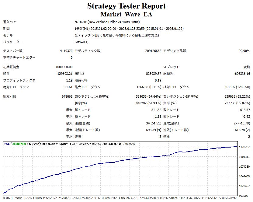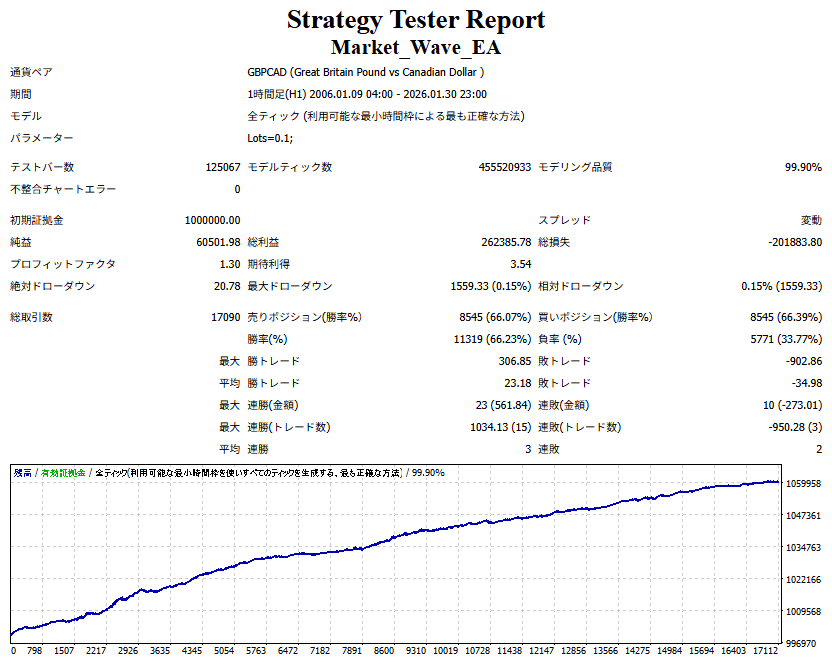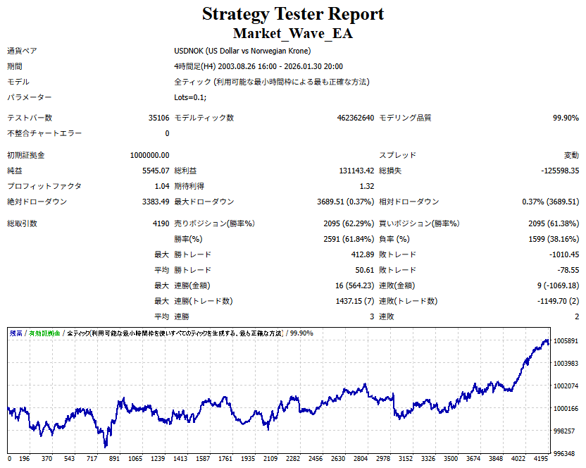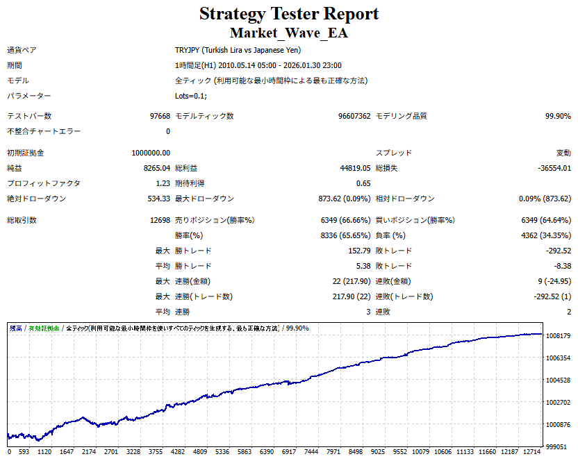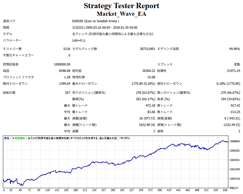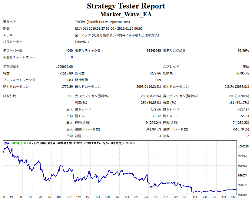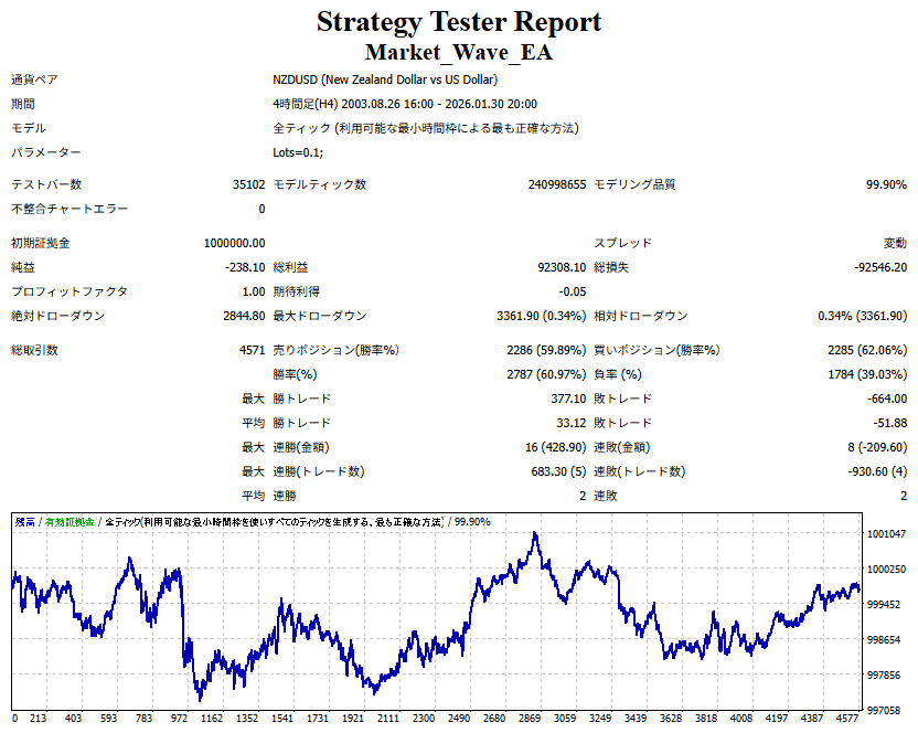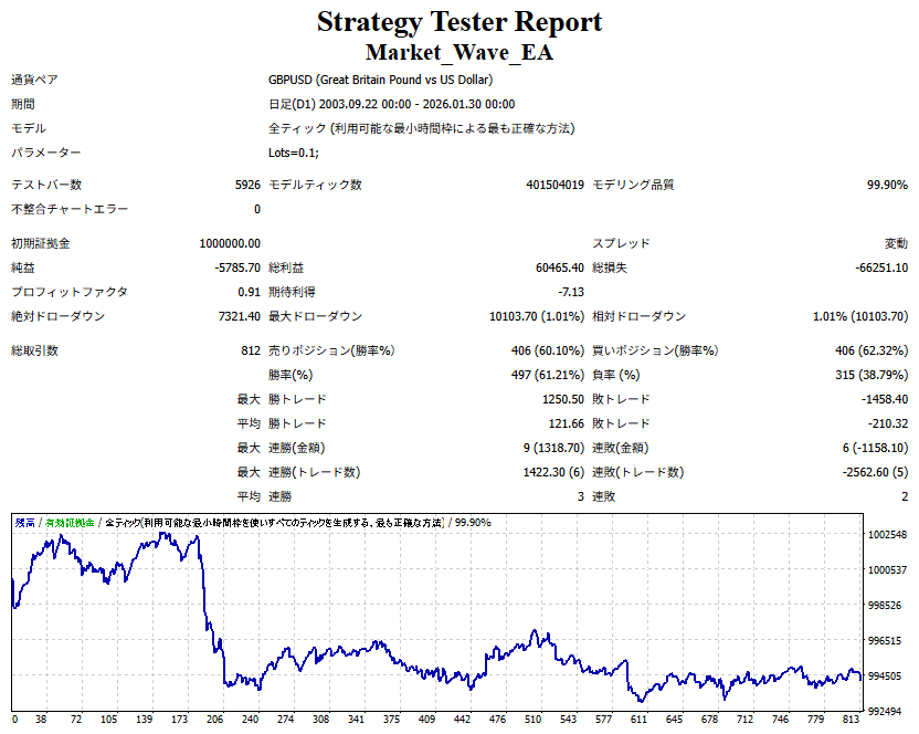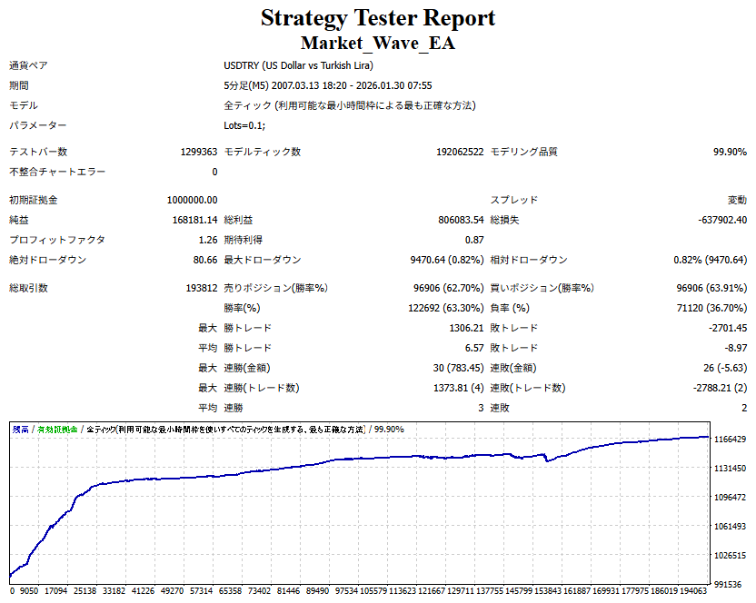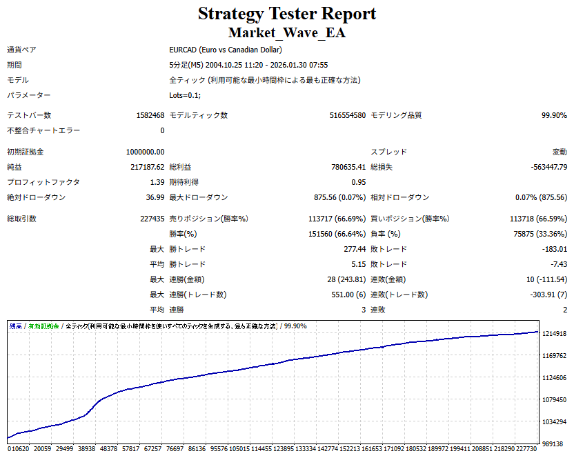 Market_Wave(バージョン:1.10 / 更新日:2025-09-25) ①「矢印サインの向きを “逆” に表示する機能」を実装しました。 ・ この機能を「true」に設定すると、矢印サインの向きが反転して表示されます。 ・ アラートおよびメール送信機能を「true」に設定している場合、通知に「Reverse」の文字が追加されます。 ・ パフォーマンスを外部出力する機能を「true」に設定している場合、すべての損益を反転して計算します。 ②「パフォーマンスを外部出力する機能」を実装しました。 ・ スプレッドは計算に含まれません。 ・ 過去チャートに既に表示されているサインは対象外で、新規に出現するサインのみが対象です。 ・ 通貨ペアなど銘柄ごとの損益計算は複雑なため、損益は「ポイント」で出力します。 ・ 出力ファイルは「Quant Analyzer 4」で読み込めるHTML形式で生成されます。 ・「Quant Analyzer 4」は無料版(バージョン4.9.2)の利用を推奨します。Pro版での対応可否は不明です。 ・「リアルチャート」や練行足などの「オフラインチャート」によるフォワードテスト、 ならびにストラテジーテスターによる「バックテスト」での出力にも対応しています。 ※ 出力ファイルの保存先は以下のとおりです。 ・「リアルチャート」「オフラインチャート」での出力時: データフォルダを開く → MQL4 → Files フォルダ ・ ストラテジーテスターによる「バックテスト」での出力時: データフォルダを開く → tester → files フォルダ ※【注意】 出力を終了する際は、サインインジケーターがファイルを保持しているため解放が必要です。 パフォーマンスを外部出力する機能を「false」に切り替えるか、開いているチャートを閉じてください。 ③ 練行足などの「オフラインチャート」で矢印サインが出現した際、アラートおよびメール送信機能が正しく動作するよう修正しました。