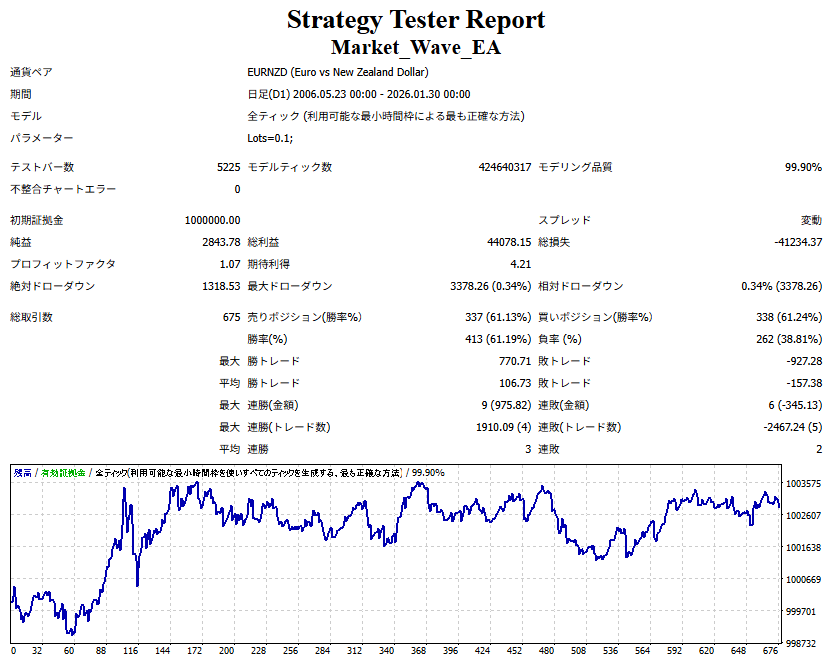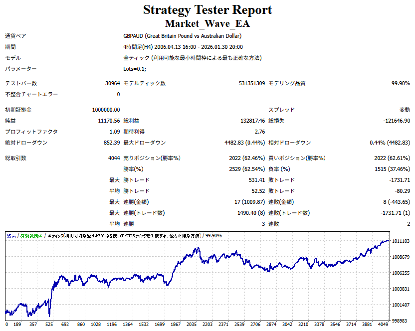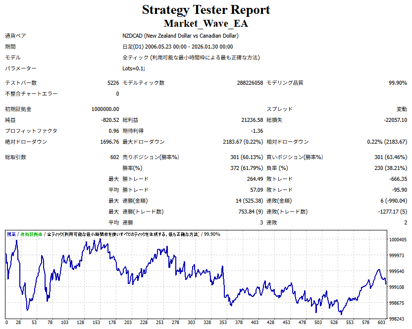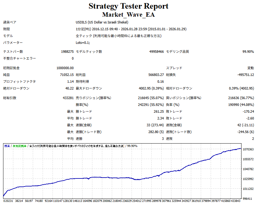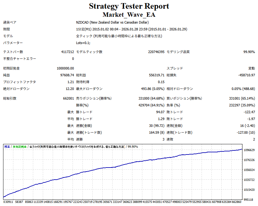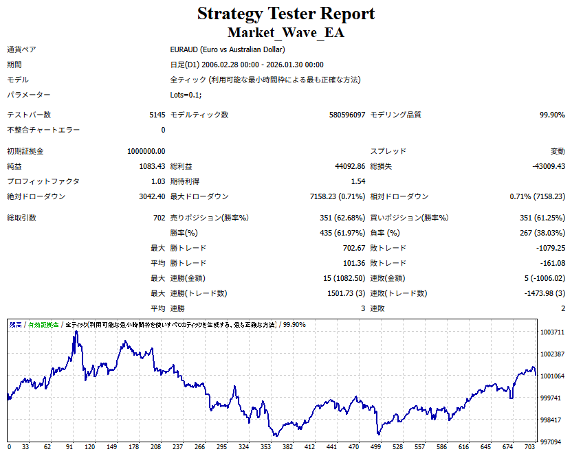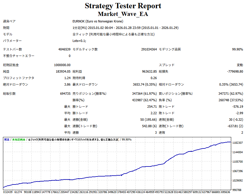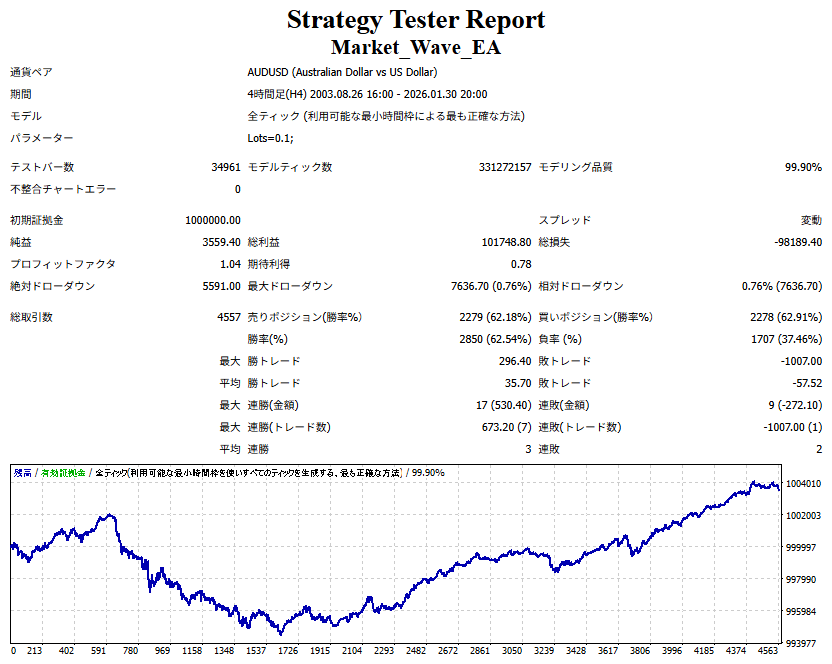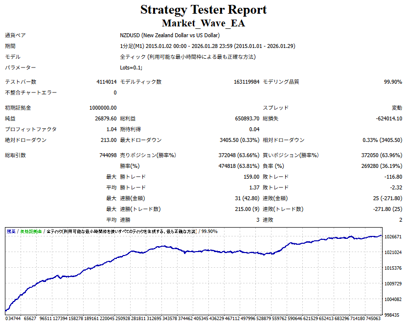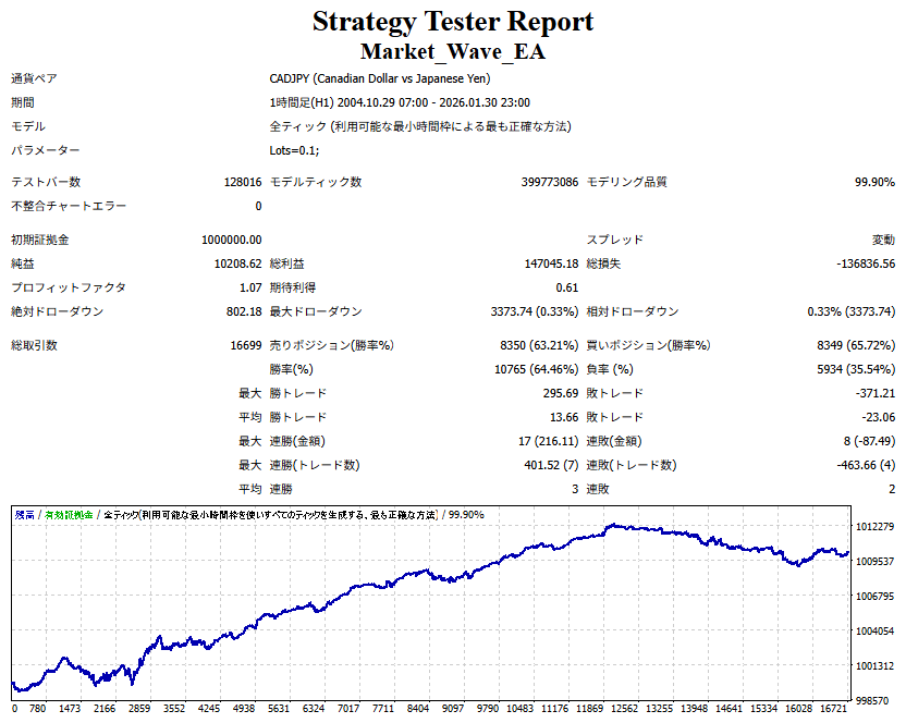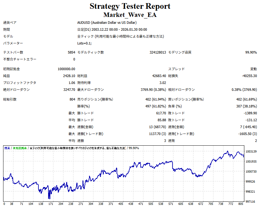 Market_Wave(バージョン:1.10 / 更新日:2025-09-25) ①「矢印サインの向きを “逆” に表示する機能」を実装しました。 ・ この機能を「true」に設定すると、矢印サインの向きが反転して表示されます。 ・ アラートおよびメール送信機能を「true」に設定している場合、通知に「Reverse」の文字が追加されます。 ・ パフォーマンスを外部出力する機能を「true」に設定している場合、すべての損益を反転して計算します。 ②「パフォーマンスを外部出力する機能」を実装しました。 ・ スプレッドは計算に含まれません。 ・ 過去チャートに既に表示されているサインは対象外で、新規に出現するサインのみが対象です。 ・ 通貨ペアなど銘柄ごとの損益計算は複雑なため、損益は「ポイント」で出力します。 ・ 出力ファイルは「Quant Analyzer 4」で読み込めるHTML形式で生成されます。 ・「Quant Analyzer 4」は無料版(バージョン4.9.2)の利用を推奨します。Pro版での対応可否は不明です。 ・「リアルチャート」や練行足などの「オフラインチャート」によるフォワードテスト、 ならびにストラテジーテスターによる「バックテスト」での出力にも対応しています。 ※ 出力ファイルの保存先は以下のとおりです。 ・「リアルチャート」「オフラインチャート」での出力時: データフォルダを開く → MQL4 → Files フォルダ ・ ストラテジーテスターによる「バックテスト」での出力時: データフォルダを開く → tester → files フォルダ ※【注意】 出力を終了する際は、サインインジケーターがファイルを保持しているため解放が必要です。 パフォーマンスを外部出力する機能を「false」に切り替えるか、開いているチャートを閉じてください。 ③ 練行足などの「オフラインチャート」で矢印サインが出現した際、アラートおよびメール送信機能が正しく動作するよう修正しました。