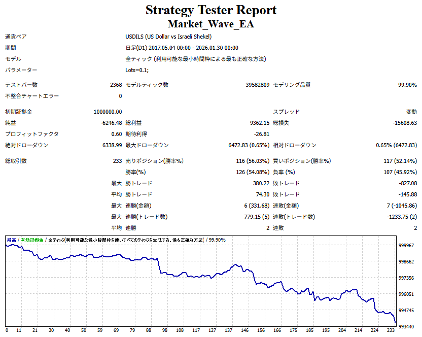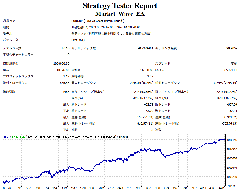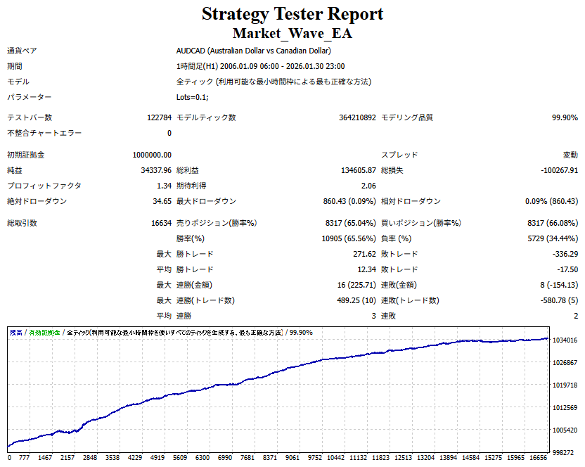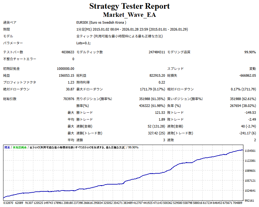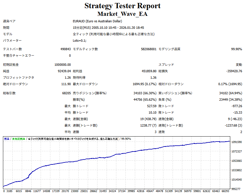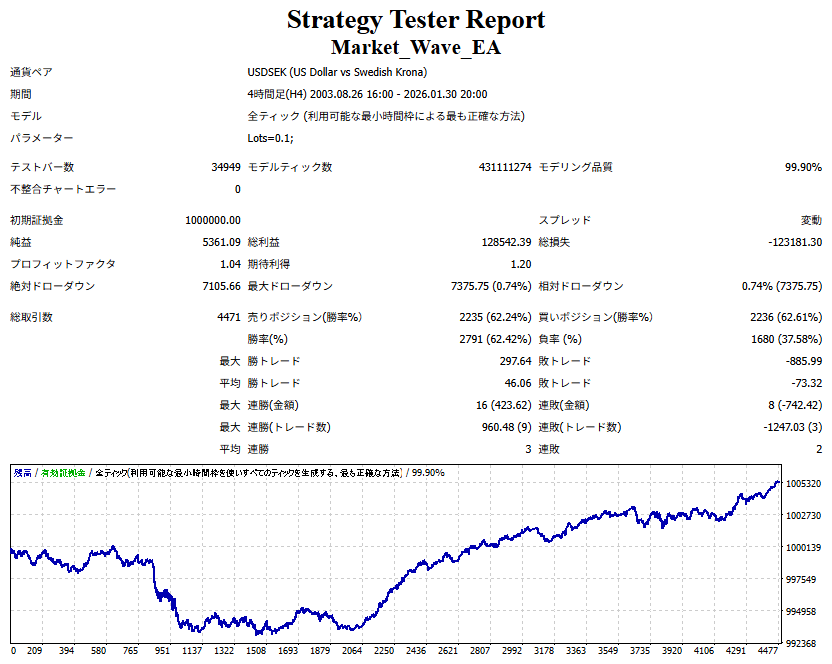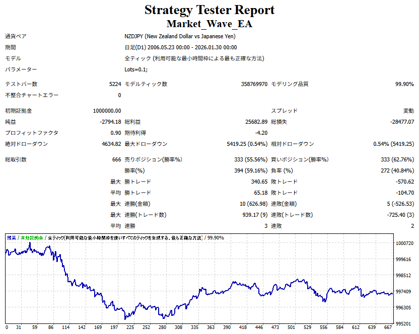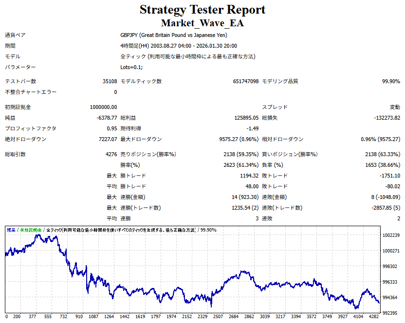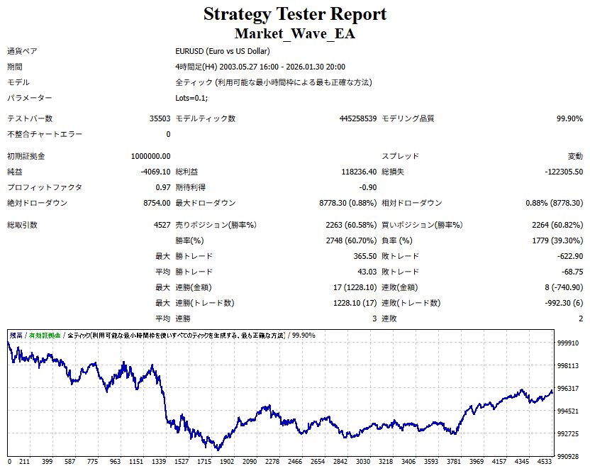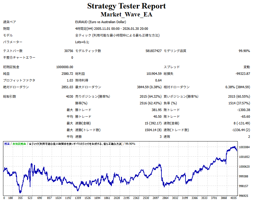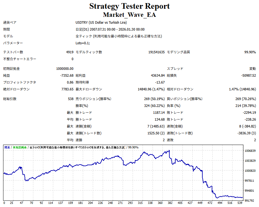 Market_Wave(バージョン:1.10 / 更新日:2025-09-25) ①「矢印サインの向きを “逆” に表示する機能」を実装しました。 ・ この機能を「true」に設定すると、矢印サインの向きが反転して表示されます。 ・ アラートおよびメール送信機能を「true」に設定している場合、通知に「Reverse」の文字が追加されます。 ・ パフォーマンスを外部出力する機能を「true」に設定している場合、すべての損益を反転して計算します。 ②「パフォーマンスを外部出力する機能」を実装しました。 ・ スプレッドは計算に含まれません。 ・ 過去チャートに既に表示されているサインは対象外で、新規に出現するサインのみが対象です。 ・ 通貨ペアなど銘柄ごとの損益計算は複雑なため、損益は「ポイント」で出力します。 ・ 出力ファイルは「Quant Analyzer 4」で読み込めるHTML形式で生成されます。 ・「Quant Analyzer 4」は無料版(バージョン4.9.2)の利用を推奨します。Pro版での対応可否は不明です。 ・「リアルチャート」や練行足などの「オフラインチャート」によるフォワードテスト、 ならびにストラテジーテスターによる「バックテスト」での出力にも対応しています。 ※ 出力ファイルの保存先は以下のとおりです。 ・「リアルチャート」「オフラインチャート」での出力時: データフォルダを開く → MQL4 → Files フォルダ ・ ストラテジーテスターによる「バックテスト」での出力時: データフォルダを開く → tester → files フォルダ ※【注意】 出力を終了する際は、サインインジケーターがファイルを保持しているため解放が必要です。 パフォーマンスを外部出力する機能を「false」に切り替えるか、開いているチャートを閉じてください。 ③ 練行足などの「オフラインチャート」で矢印サインが出現した際、アラートおよびメール送信機能が正しく動作するよう修正しました。