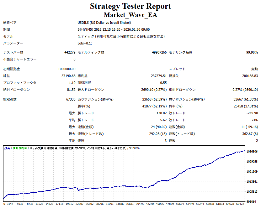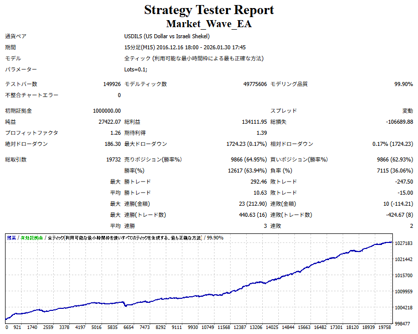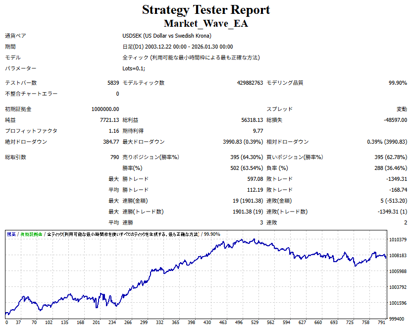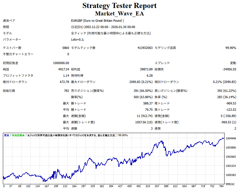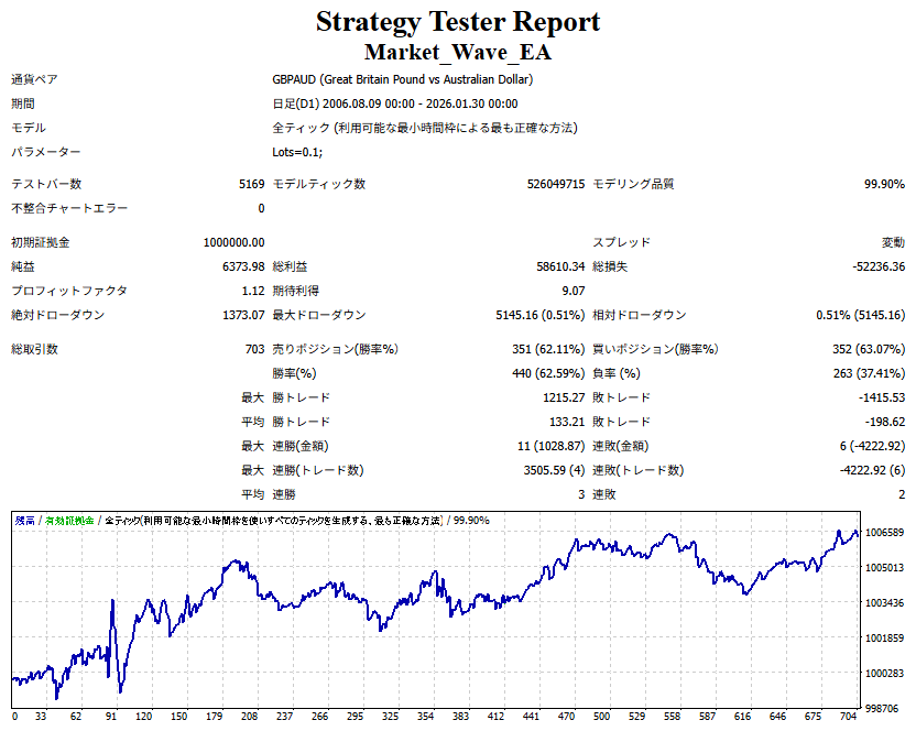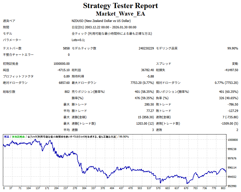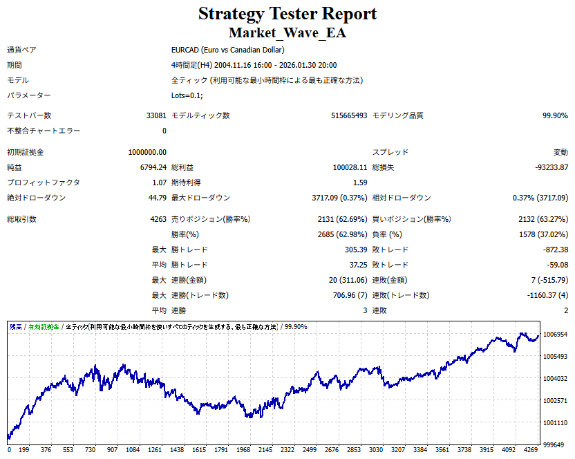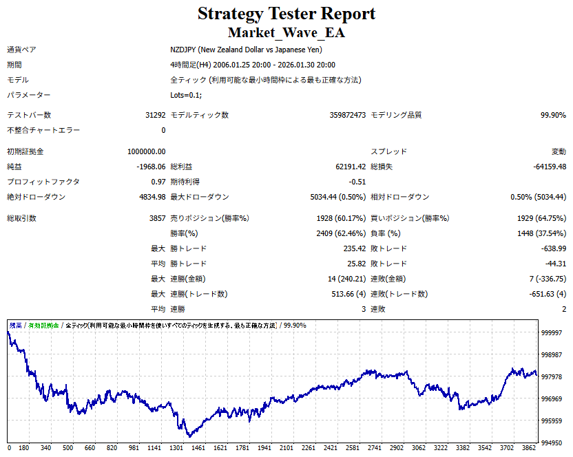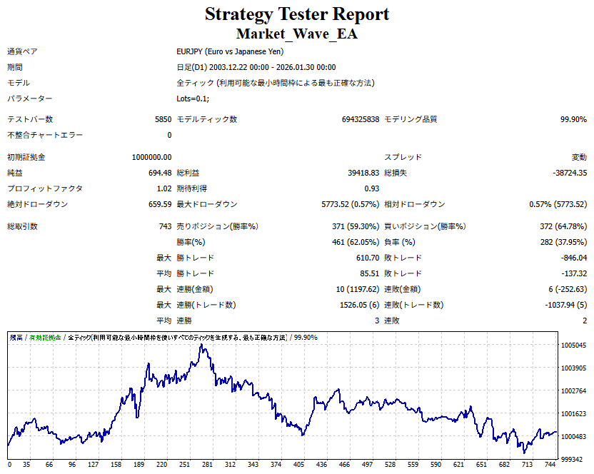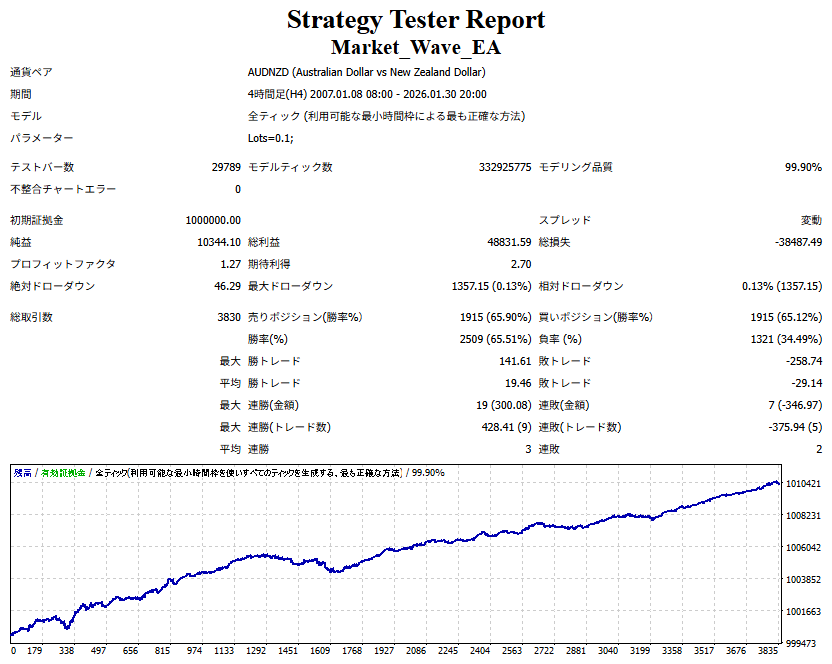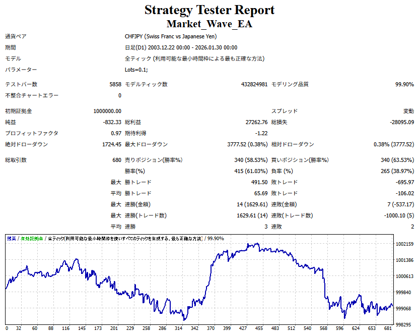 ● 実際の運用方法 「● 論より証拠」の項で公開した検証は、スプレッドをほぼゼロに設定して実施したものですので、 実際の運用では、少なくともスプレッドなどのコスト分は利益を伸ばす必要があります。 言い換えれば、そのコスト分だけ利益を伸ばすだけで、安定した取引が期待できるということです。 「それが難しいのでは?」と思われる方もいるかもしれませんが、心配はいりません。 ポイントは── 相場が “波” の方向に逆らっているときは取引をしない、この徹底だけです。 「コスト分の利益を伸ばす」と考えるのではなく、 「負けやすい局面を避けることでコストを浮かせる」と考えていただければ分かりやすいかと思います。 チャート説明