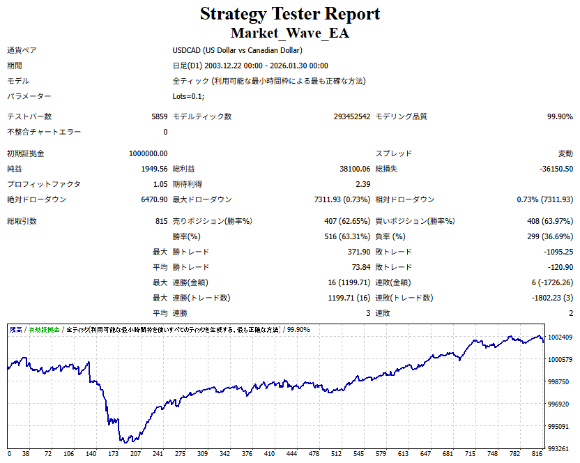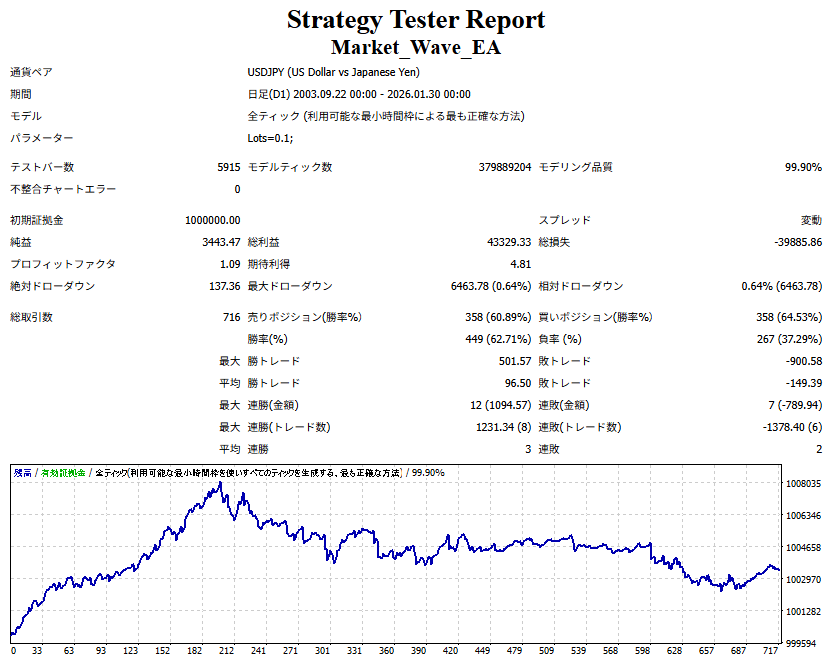 Market_Direction(バージョン:1.20 / 更新日:2025-10-03) ①「パフォーマンスを外部出力する機能」を実装しました。 ・ 初動、すなわち最初のサインのみを対象にドテン取引を行った場合のパフォーマンスを出力します。 ・ それ以外の仕様は Market_Wave と同様です。 ② 上記の「パフォーマンスを外部出力する機能」において、出力名を任意に設定できるようにしました。